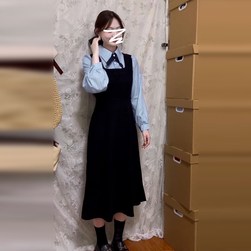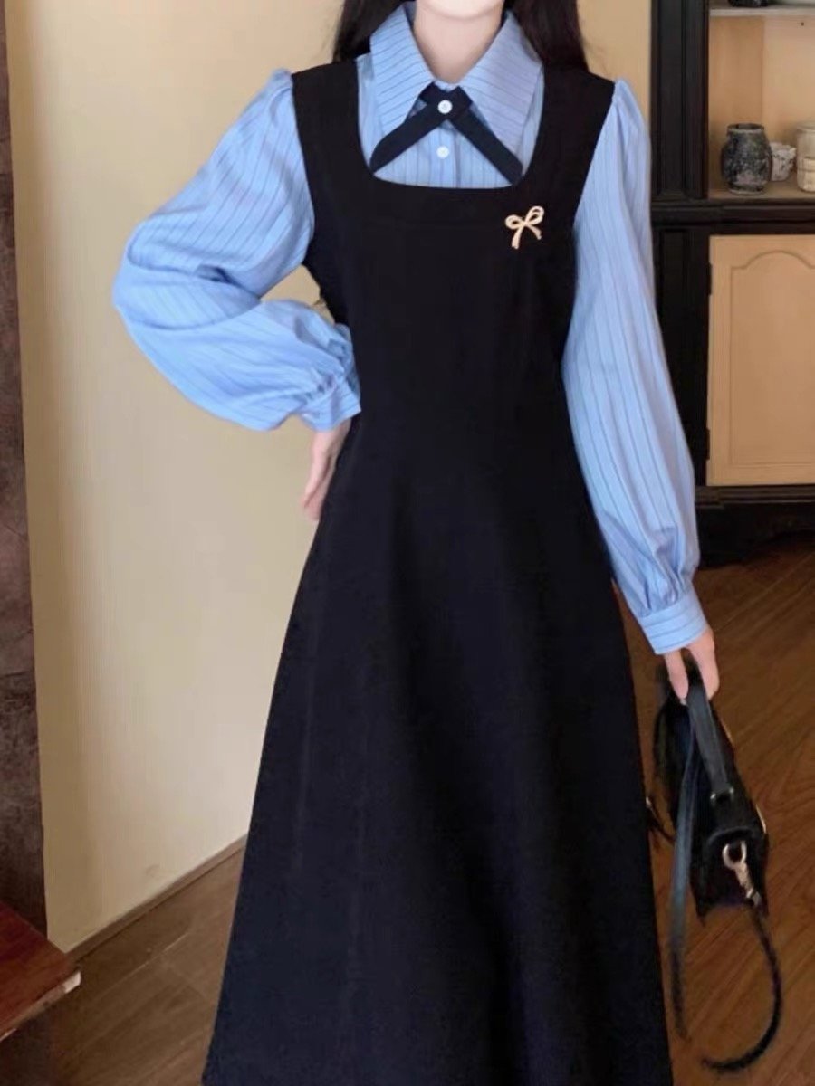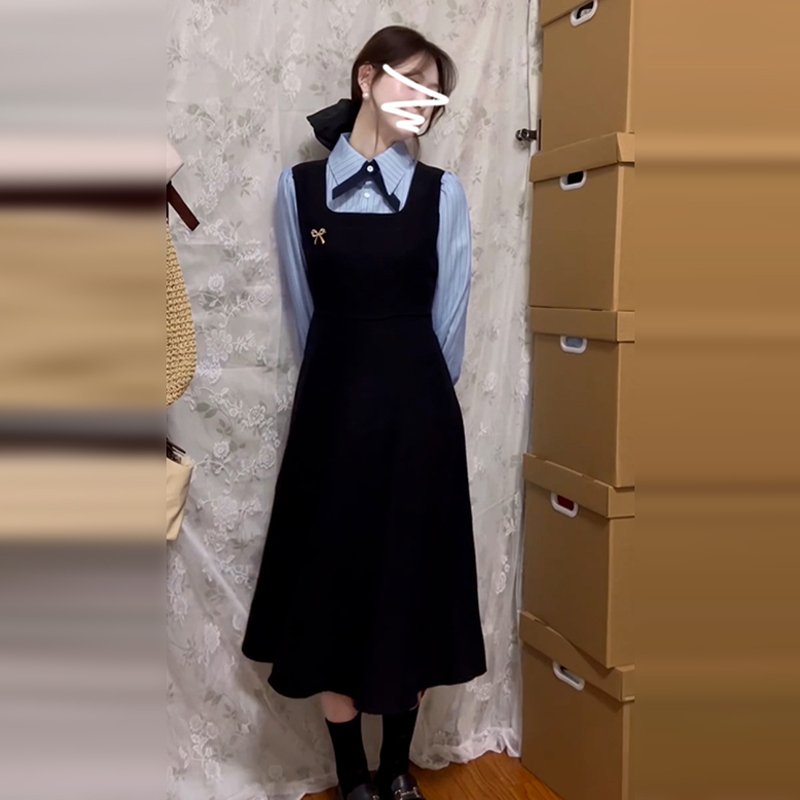 黑色假两件长袖连衣裙法式学院风吊带长裙