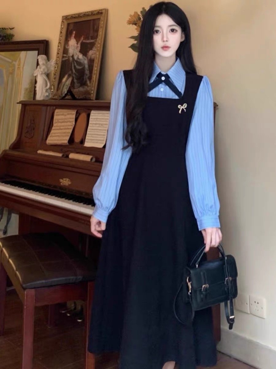 2024早初秋新款黑色假两件长袖连衣裙小个子女法式学院风吊带长裙