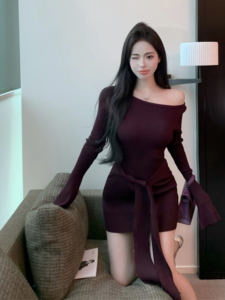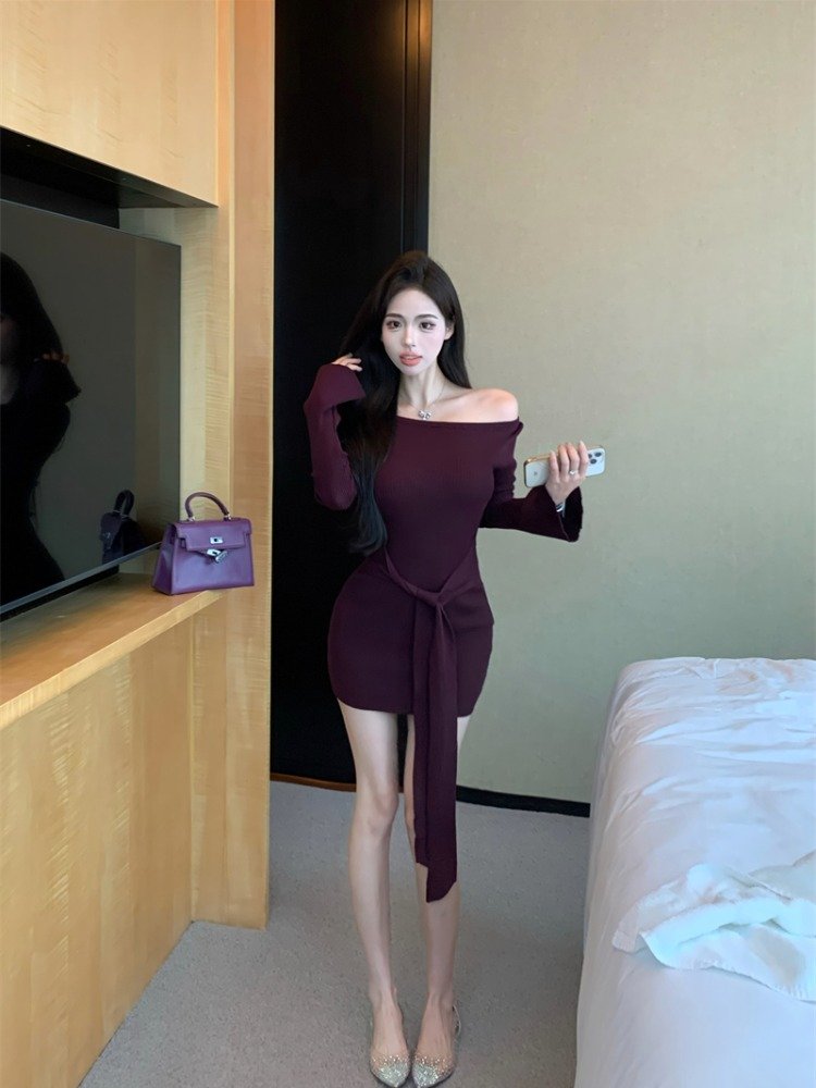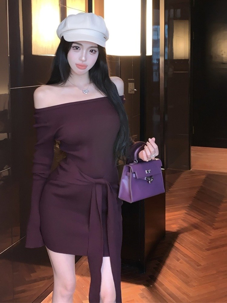 纯欲辣妹紫色一字肩长袖连衣裙女