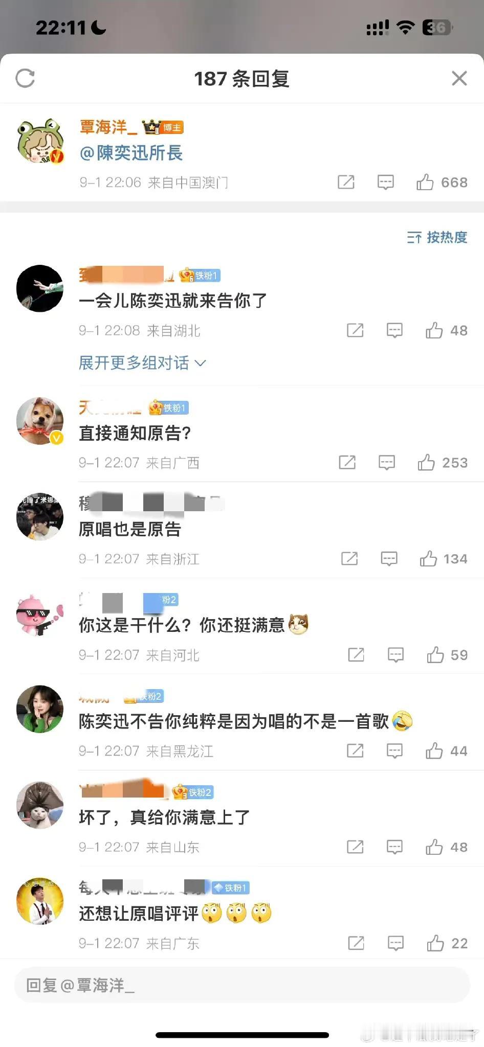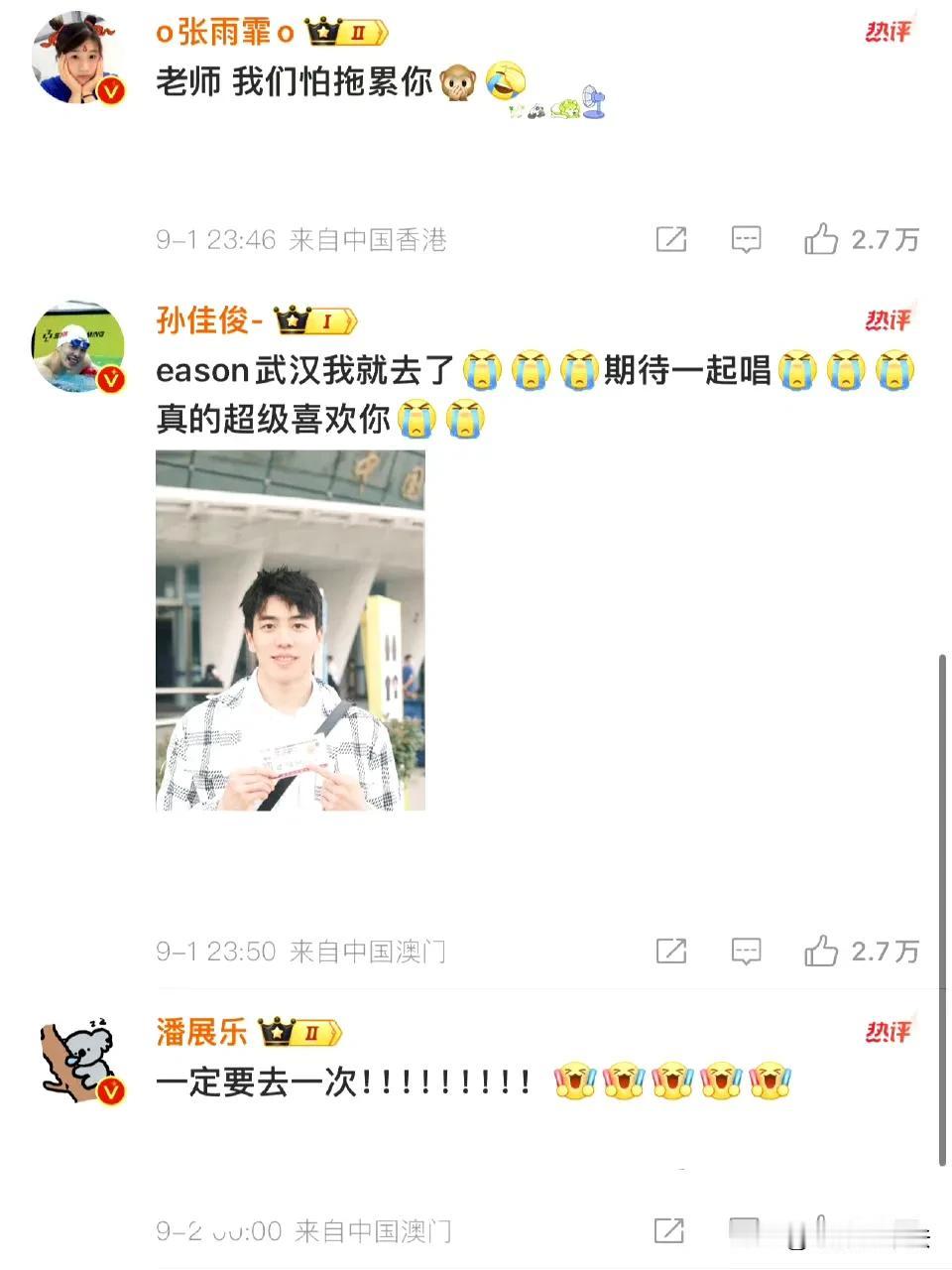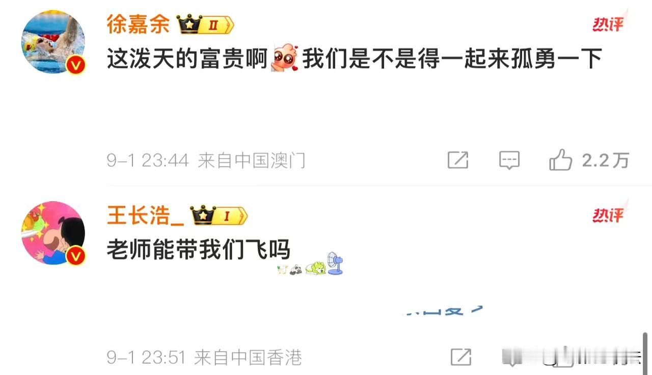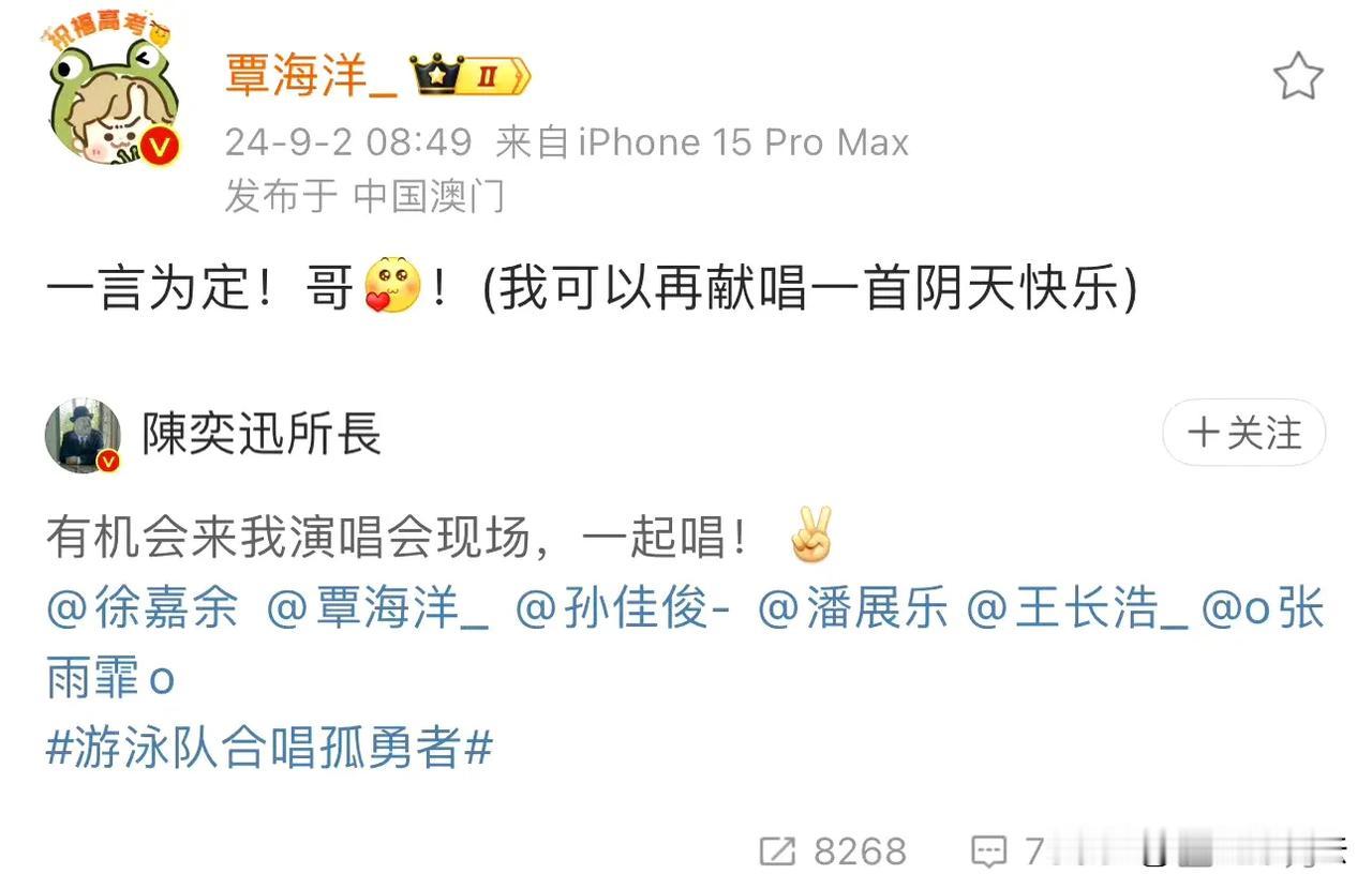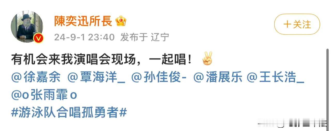 陈奕迅被告者名单出现了! 9月2日,“陈奕迅被告者名单”这个话题突然冲上热搜,猛一看还以为是陈奕迅批量起诉了侵权者,点进去才发现,原来他为自己的演唱会@了国家游泳队的徐嘉余、孙佳俊、潘展乐、王长浩、张雨霏,六位为国争光的奥运健儿也迅速热情给了陈奕迅回应。 网友看后直呼上当和好玩: 还以为告了6个人。 哈哈哈,你可以是原唱也可以是原告。 游泳队真的很擅长顺竿爬哈哈哈。 覃海洋已经做好合唱的准备了。 唱孤泳者吗? 严谨一点,Eason最后那句“一起唱”应该改成“听你们唱!” 本来只想客气一下,现在一定得去了! 游泳队都好可爱。 @樊振东,还有这一位呢? 楼上的,陈所长已经单独为东哥开辟新天地了。 别忘了粉头东哥。 其实海洋不假唱也不太对得起歌迷的。 …… 有趣灵魂之间的互动太友爱了,这样的互动为茶余饭后的生活增添了很多乐趣,不介意多来点,期待国家游泳队和陈奕迅在演唱会上合唱《孤勇者》。 另外,真心建议陈奕迅改编一下歌词,把《孤勇者》改成《孤泳者》,让这首新歌成为国家游泳队专属版。