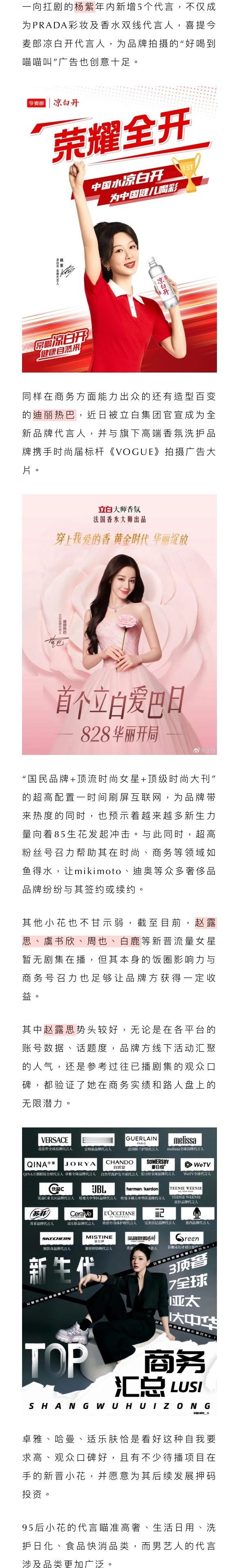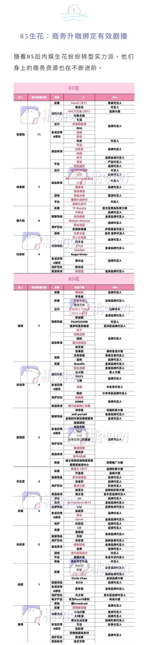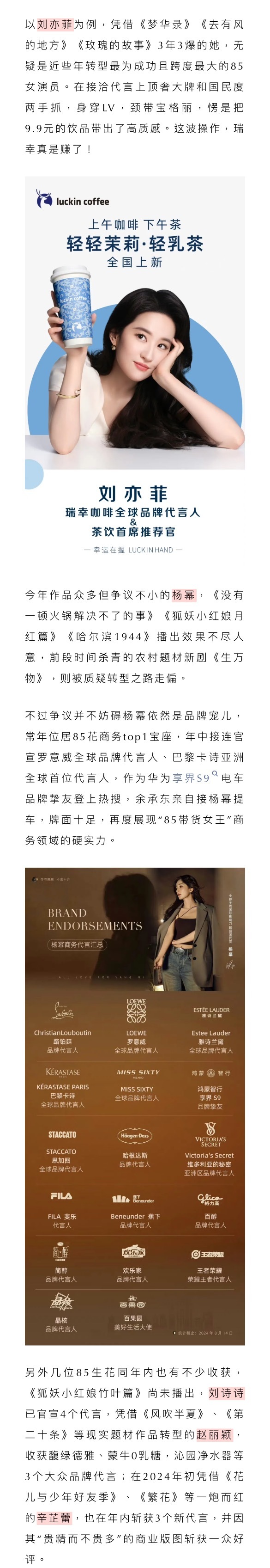 85生花逐步完成流量到实力派转型,品牌将也其纳入考量范畴。刘亦菲、赵丽颖、刘诗诗、张若昀、魏大勋等商务实绩绑定作品口碑,杨幂仍居85女艺人商业价值榜首。