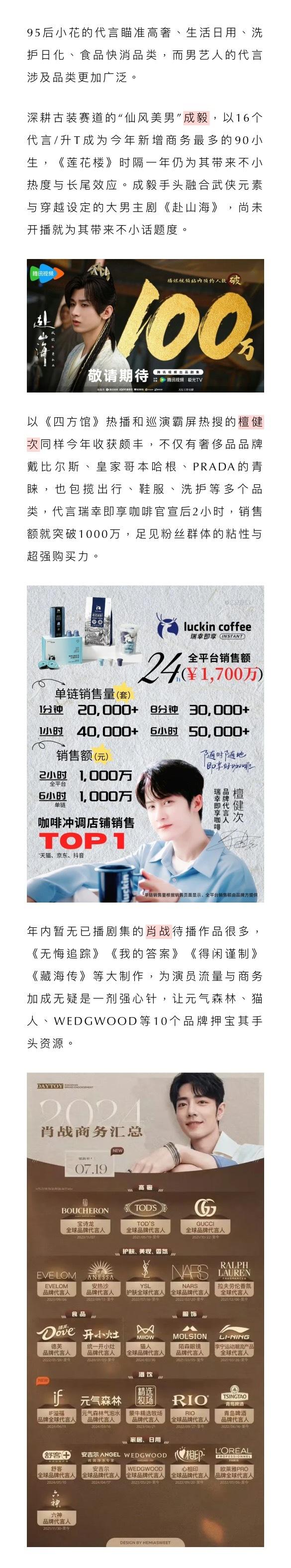 90、95势头正盛,男艺人资源飙升显著。成毅、檀健次、于适、杨紫爆款剧有效提升商务质量,迪丽热巴、王一博、肖战、赵露思等长期被品牌看重。