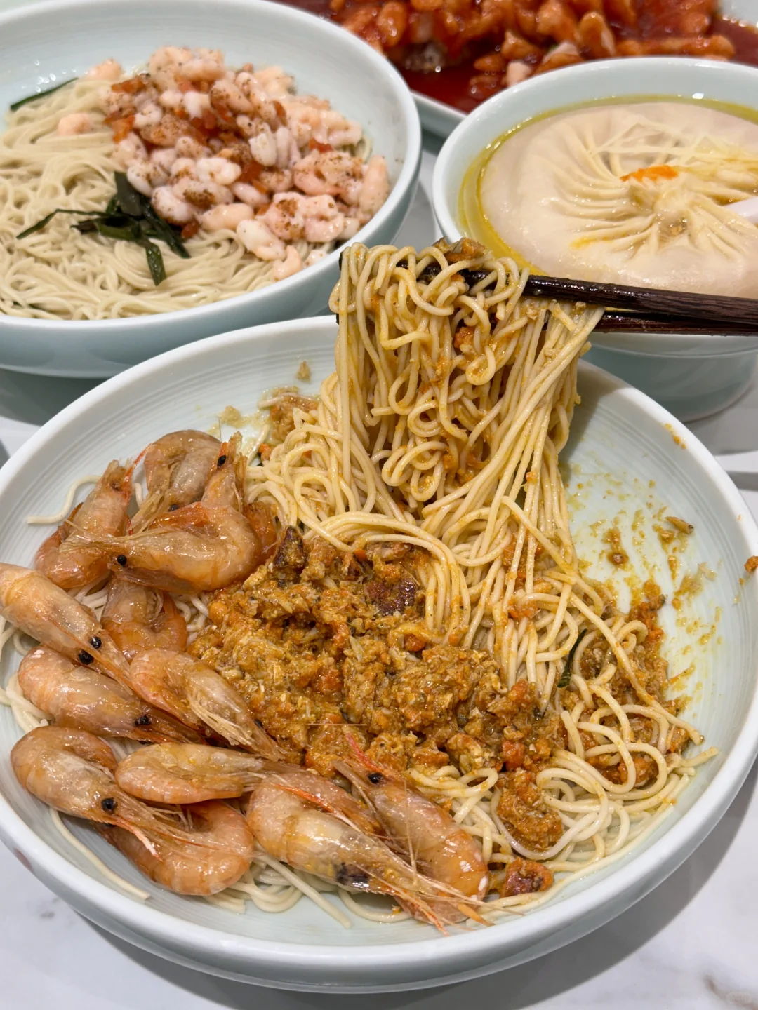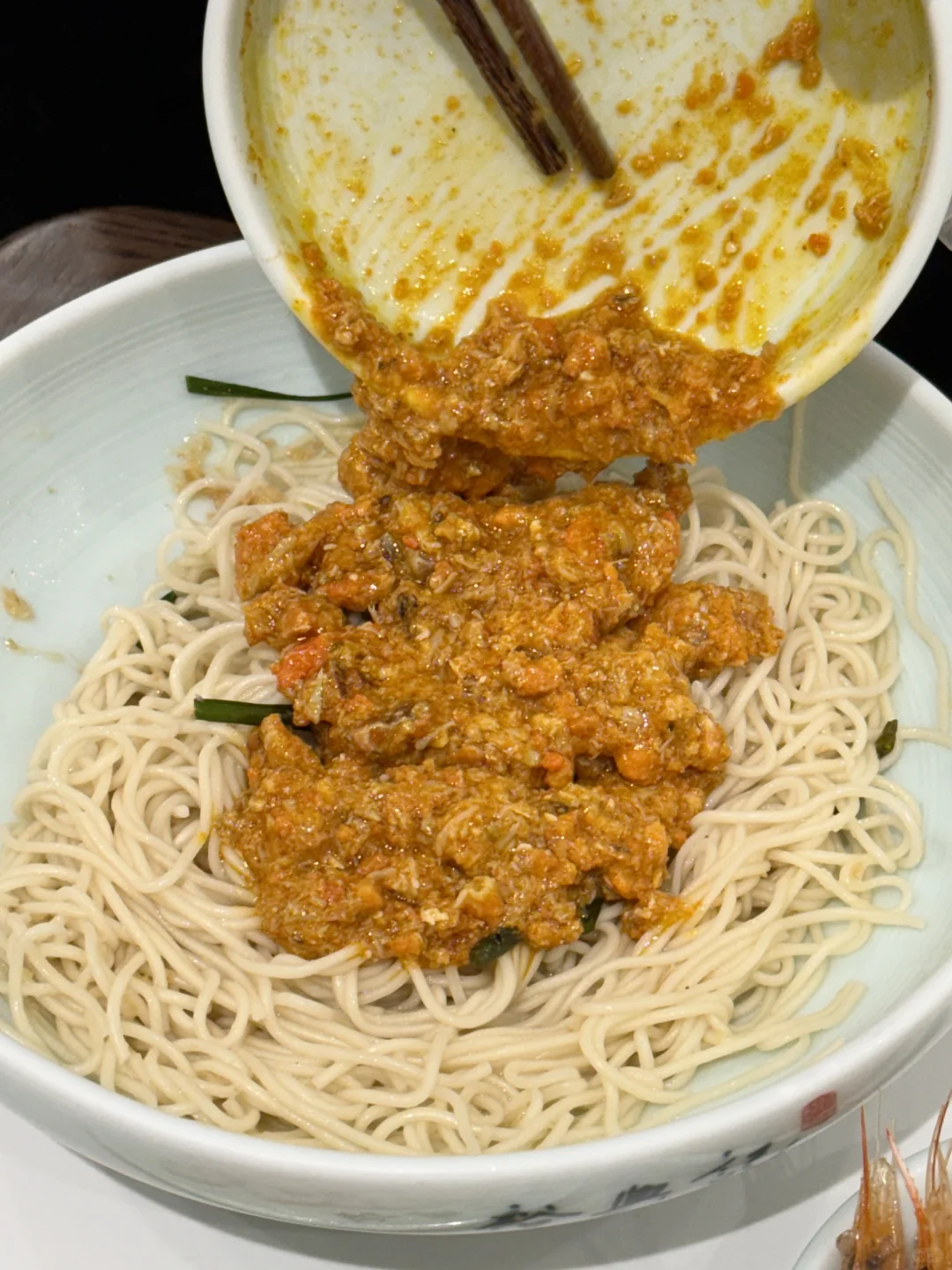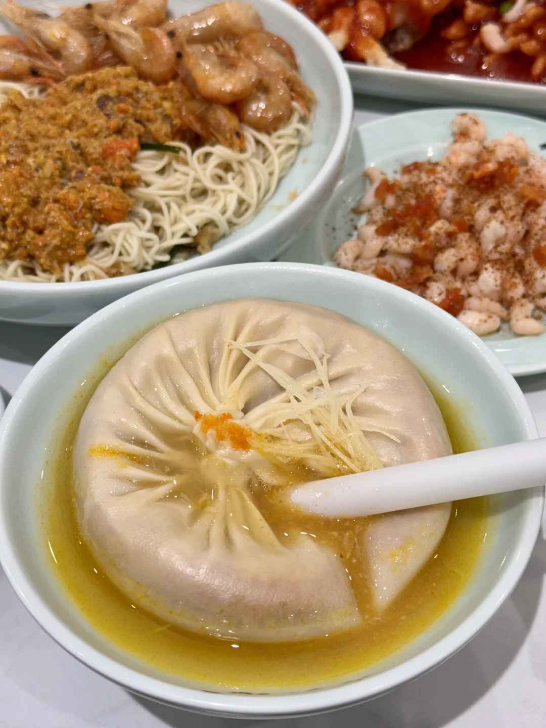 就在外滩边上的老字号蟹黄面!吃完还能去外滩city一下~ 蟹黄浇头足足有八只螃蟹🦀!再加上蟹醋buff加成一口下去太满足了🤤! 还有敲大号的蟹黄大汤包!记得用吸管嗦着吃!蟹黄汤汁zei爽~