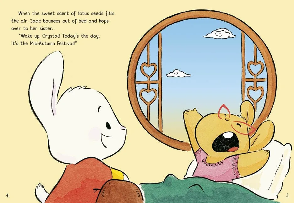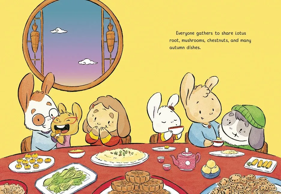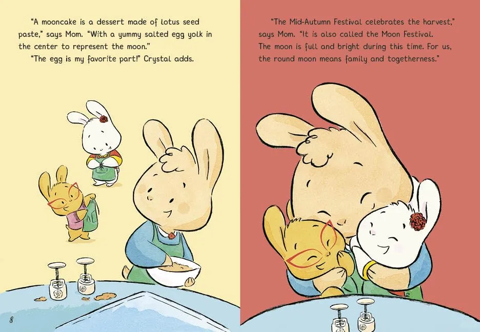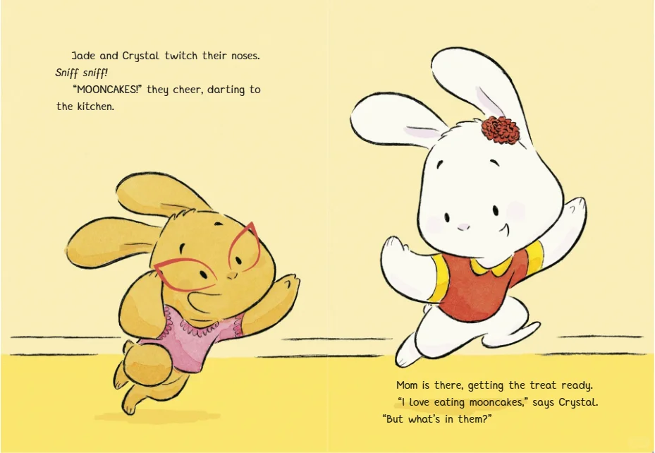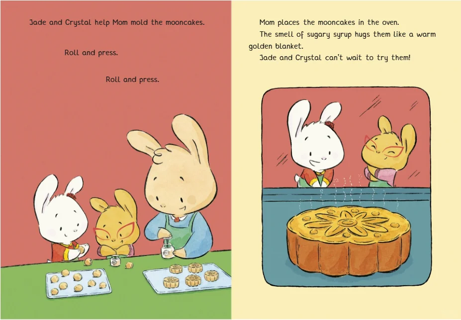 当水晶问月饼是用什么做的时,妈妈回答说:“莲蓉……中间有一个美味的咸蛋黄,代表月亮。”她解释说,中秋节是庆祝丰收的节日,此时升起的月亮代表家庭。