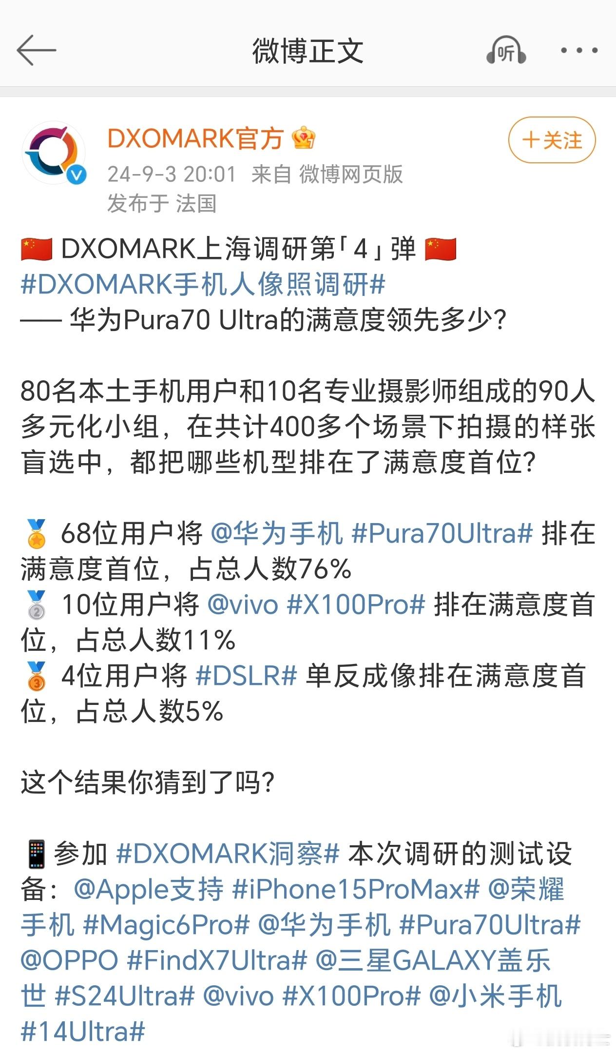 DXO人像样张盲选调研:华为Pura70 Ultra满意度遥遥领先,占比76%v