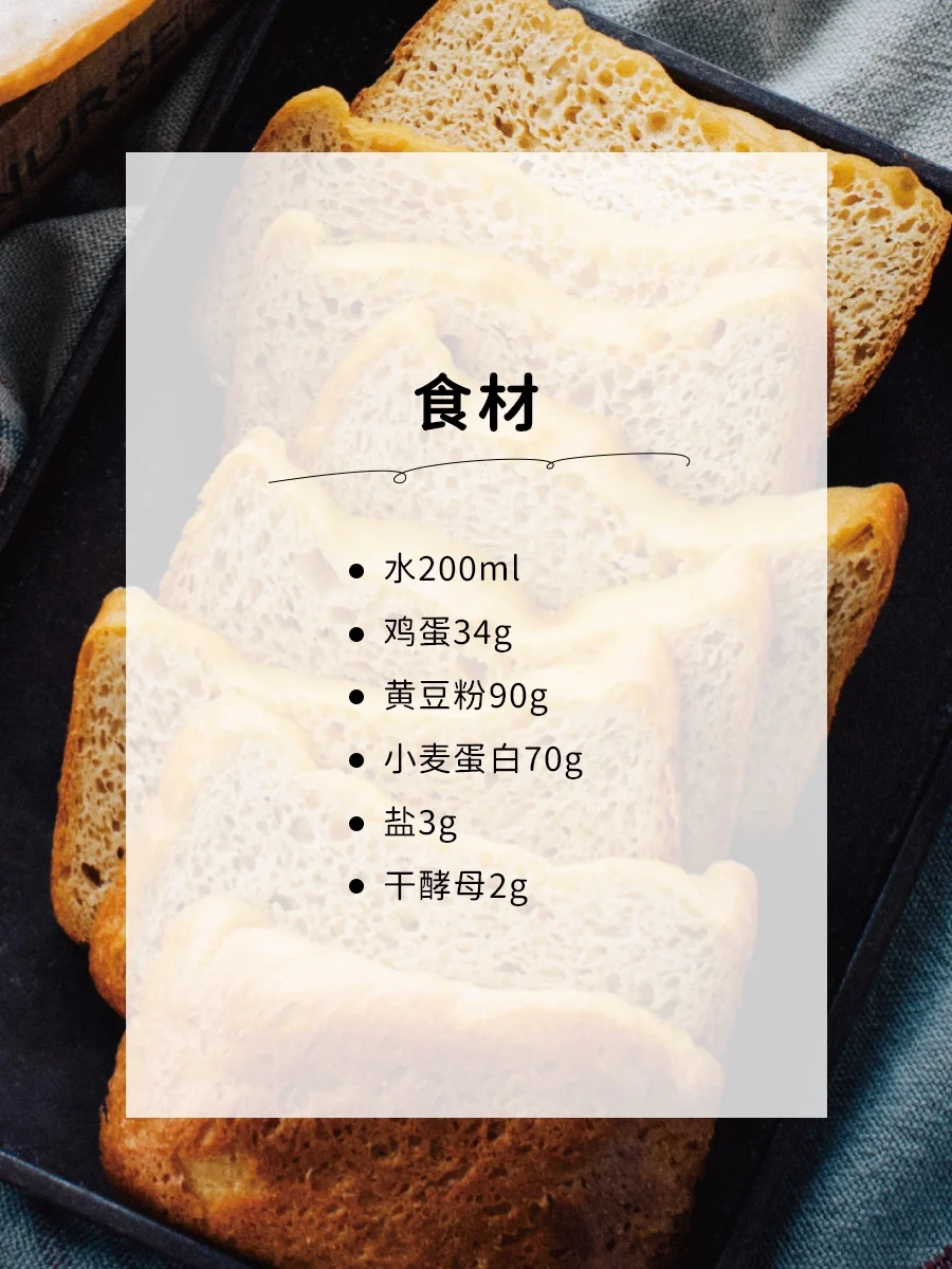 黄豆从中医角度看 可是非常适合脾胃虚弱,气血不足的小伙伴 是天然健脾利湿的好食材 以黄豆粉为食材的面包🍞 松软绵密的面团,搭配着淡淡的豆香🌿 好吃又养生,快来试试吧 - 📝食材 水200ml 鸡蛋34g 黄豆粉90g 小麦蛋白70g 盐3g 干酵母2g - 📝制作方式 1、水和鸡蛋混合后用搅拌器搅匀; 2、依次将【1】、黄豆粉、小麦蛋白、盐和干酵母放入面包桶; 3、选择菜单【3.减糖面包】,按下开始键 - 🌟食谱中使用的产品 siroca家用速烤轻食面包机