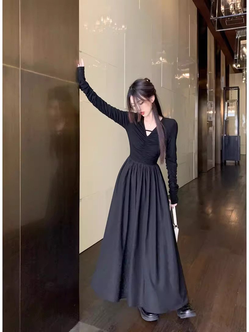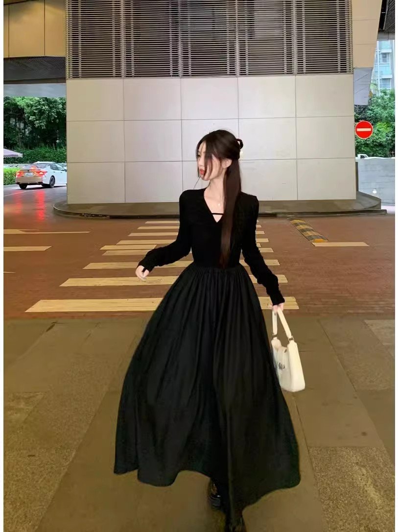 早秋季女装法式黑色V领长袖连衣裙小个子2024新款小众设计感长裙