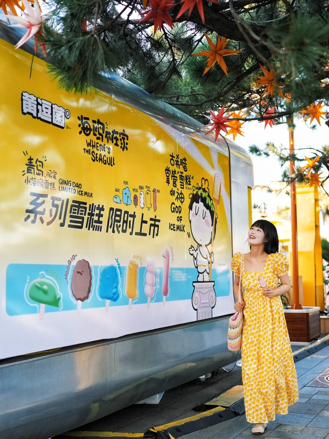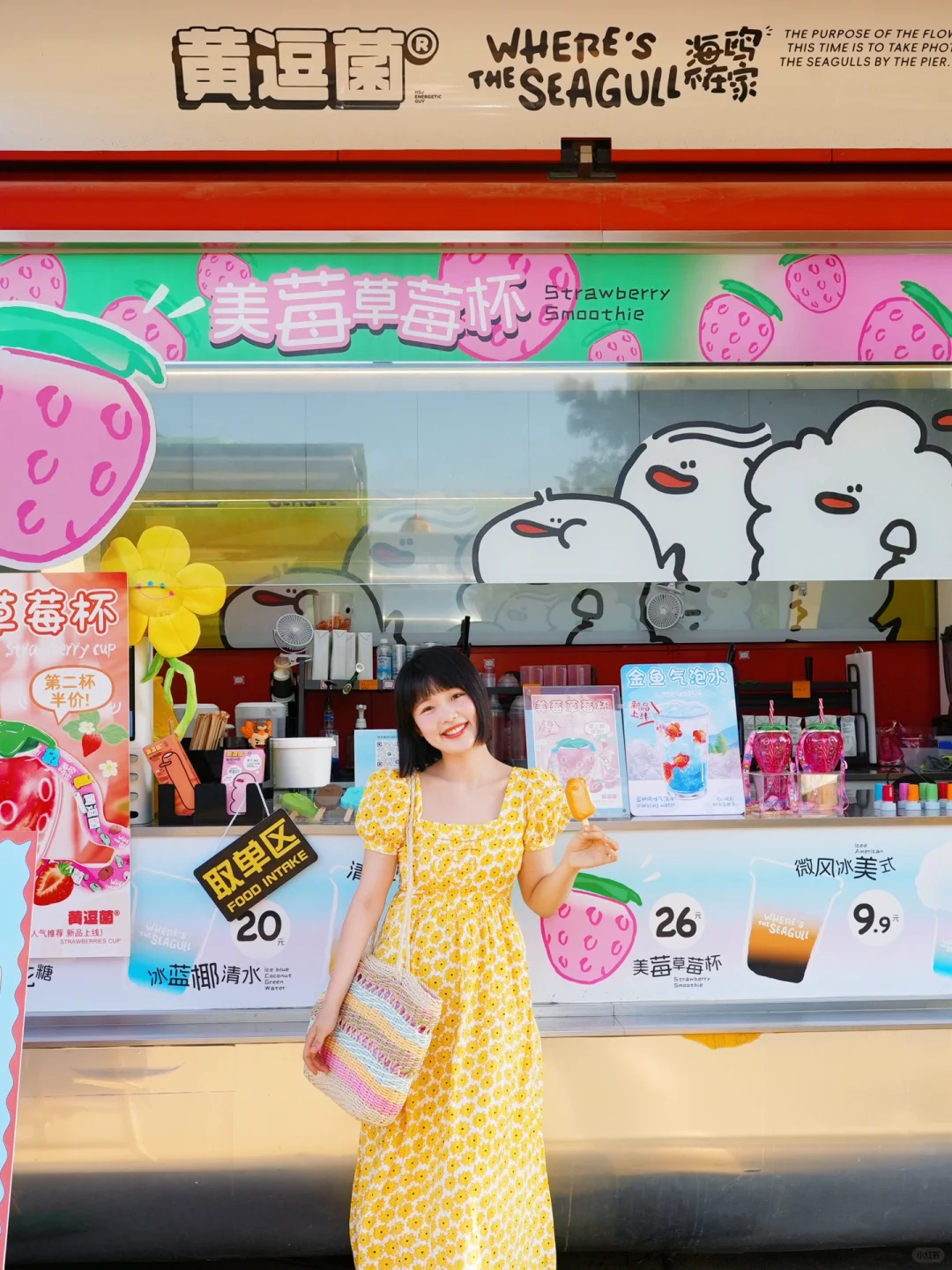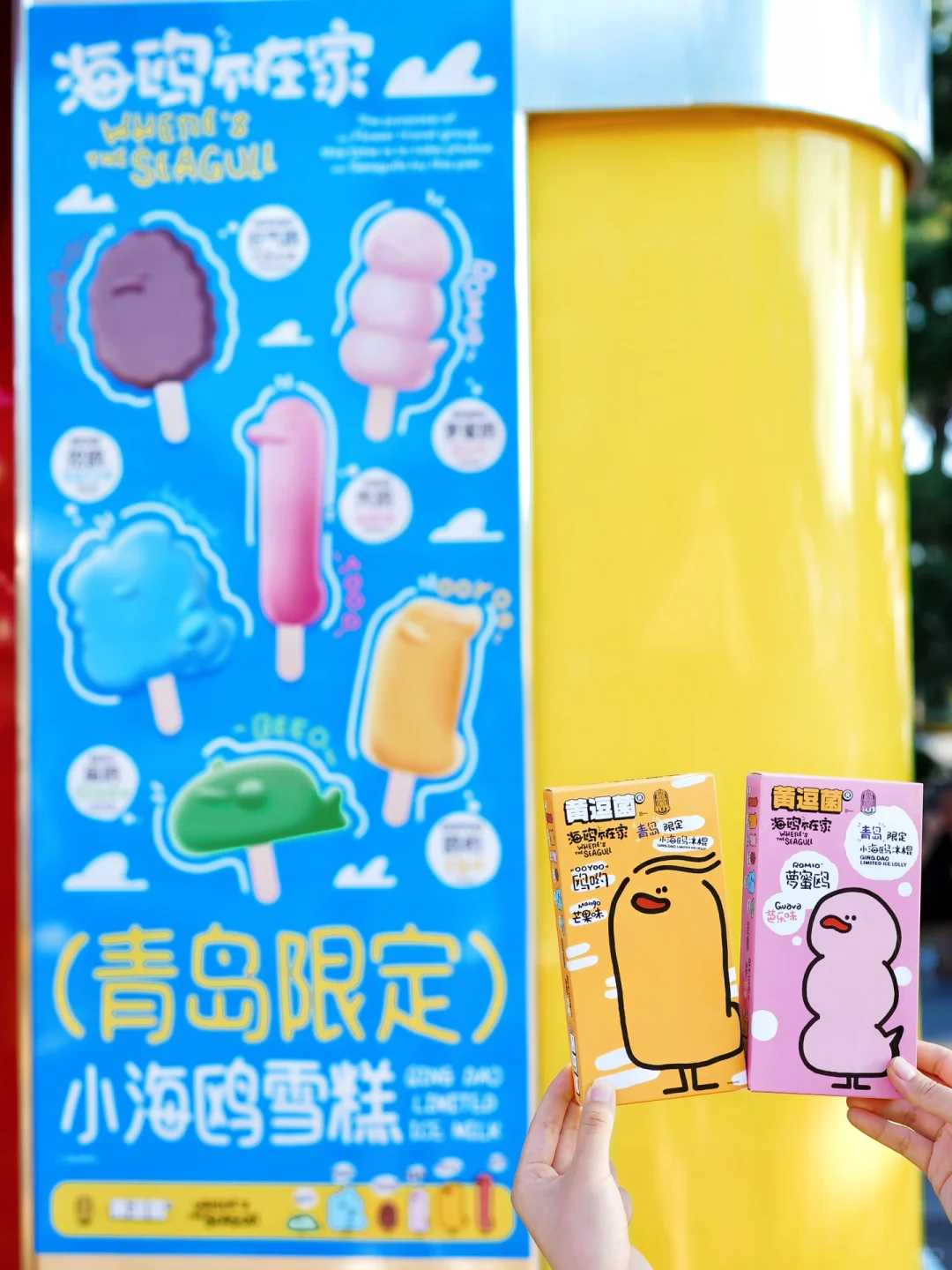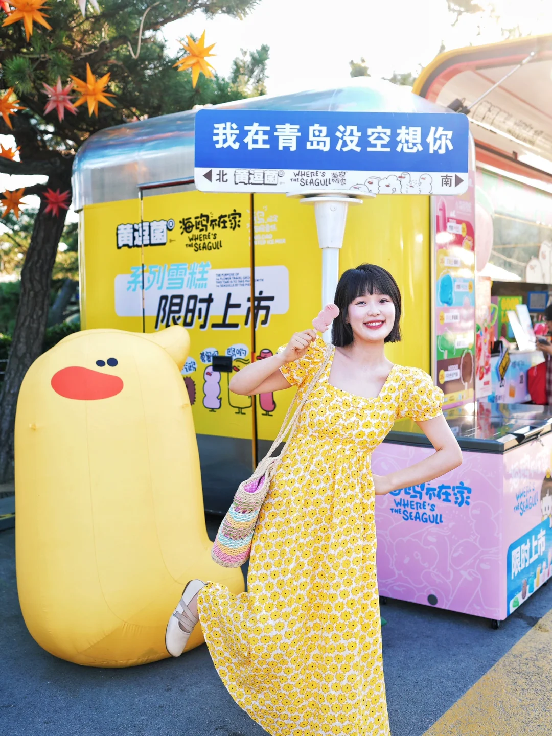 打卡栈桥一定不能错过的青岛周边! 尊嘟太太太可爱了! · 在面对栈桥的右手边🫱 有一辆黄色的黄逗菌餐车!! 不仅可以吃到“海鸥不在家”文创雪糕🍦 还有超级萌的饮品~拎在路上好多人来问! 餐车也有很多可可爱爱的打卡机位📷 现在还有扇子和包包挂件周边✅ ·