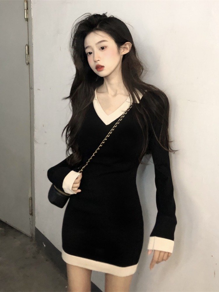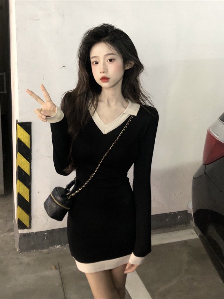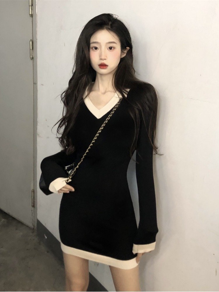 纯欲辣妹黑色针织V领长袖连衣裙女