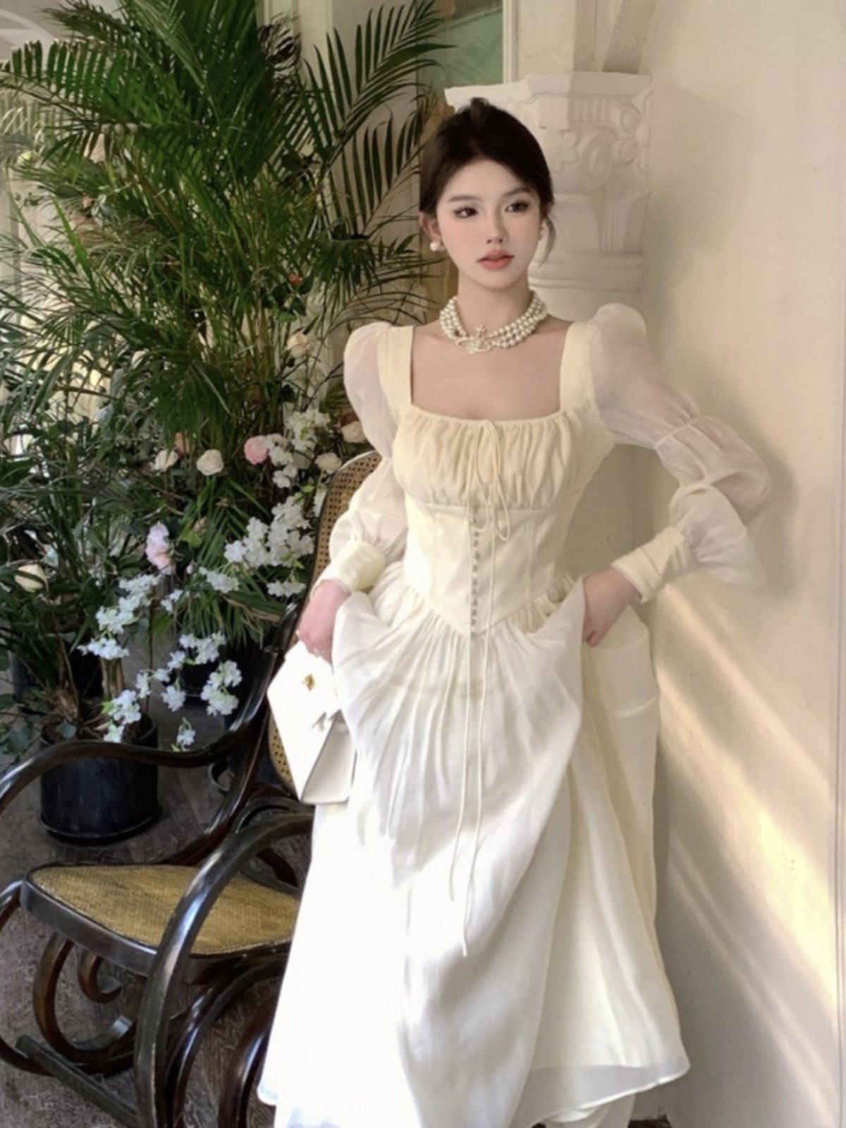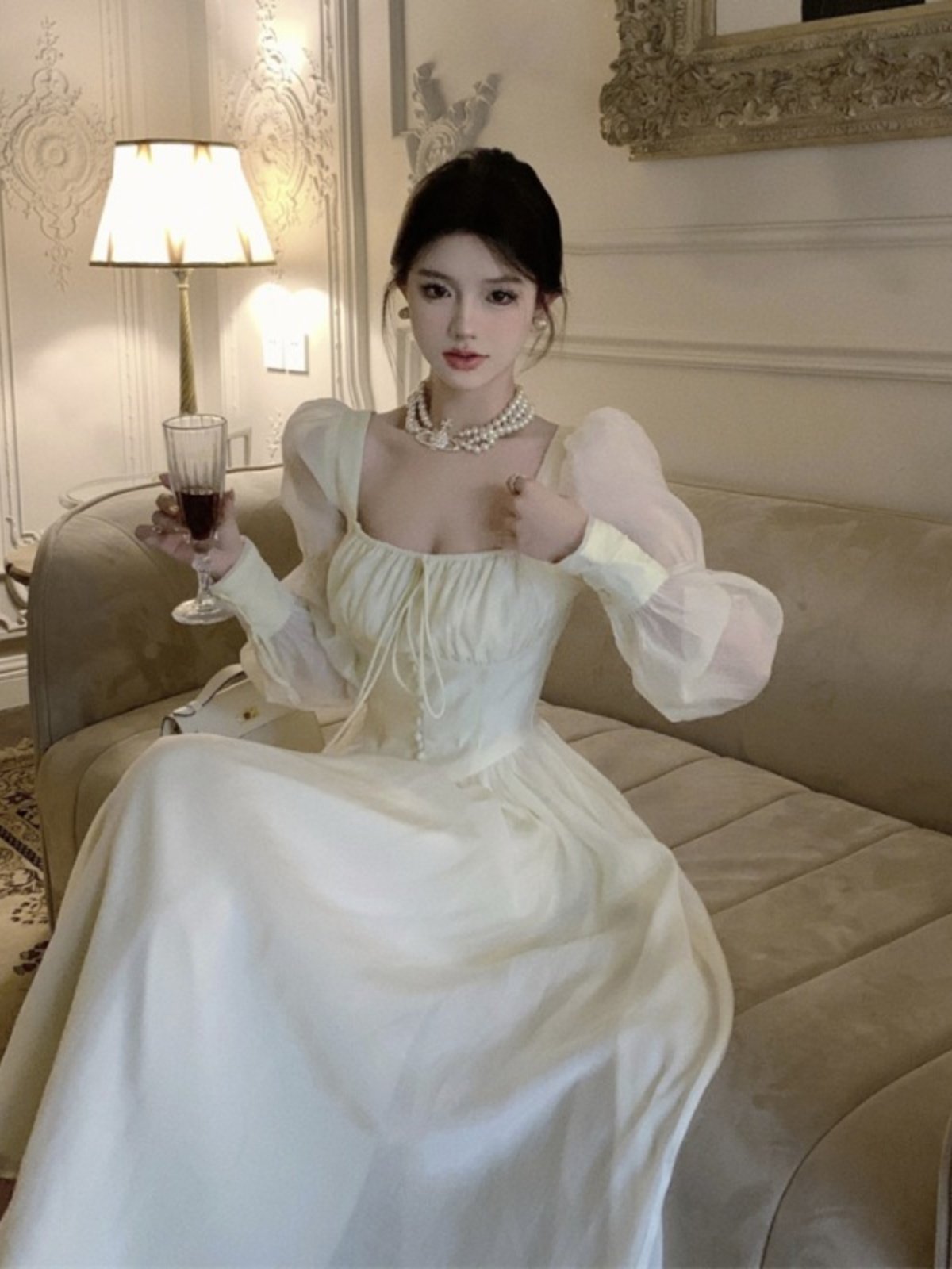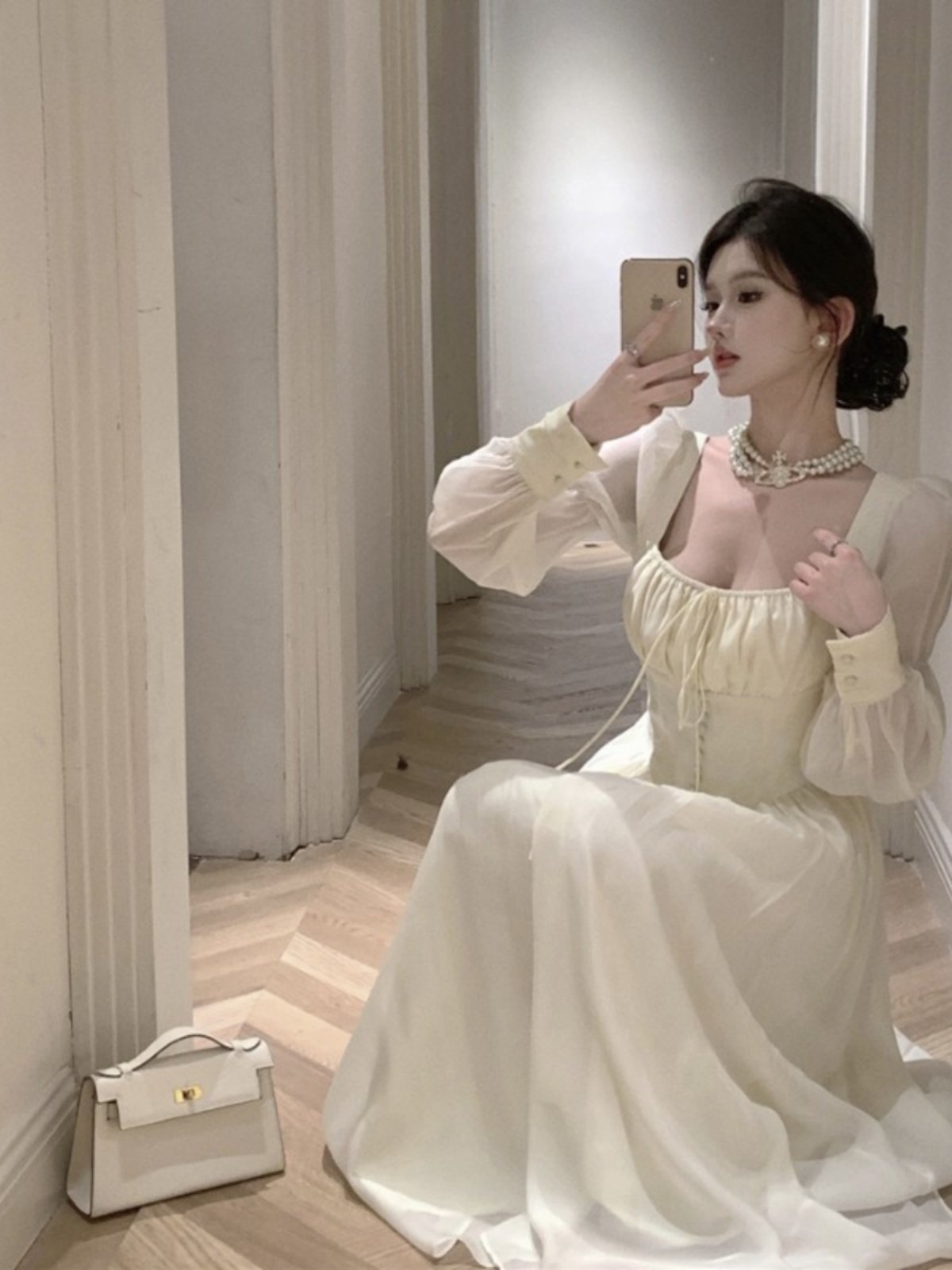 法式气质雪纺方领长袖连衣裙女早秋季