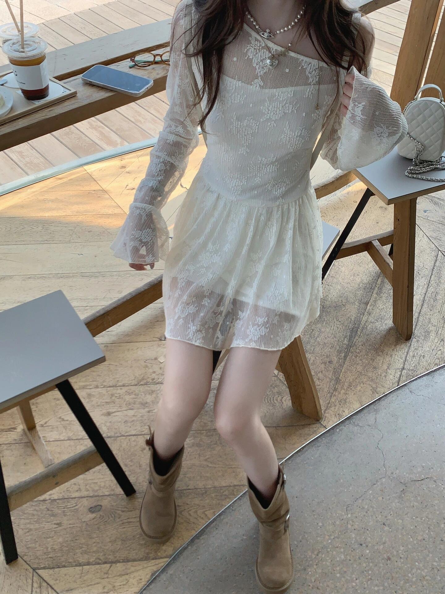 白色蕾丝长袖短款连衣裙小个子
