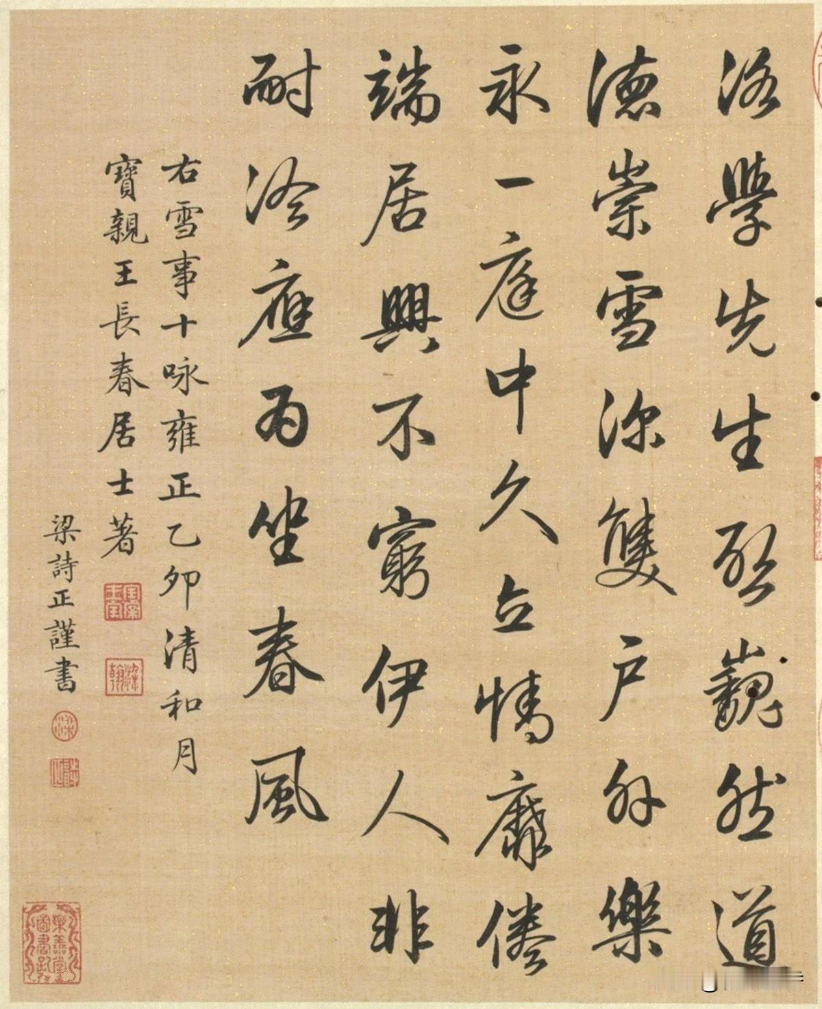 欣赏一下乾隆“御用书法家”梁诗正的行书吧,是不是让你有惊艳的感觉? 清朝雍正八年,梁诗正科举考试中得探花,之后的仕途一路开挂,还被选拔至尚书府担任太傅的重要职责,肩负起教导皇室子弟的重任。 这件行书,是梁诗正行书《雪事十咏》,其风格工整、清晰著称,笔锋锐利,干净而清新,据说启功先生的“启功体”也从梁诗正这里汲取了很多营养,而且他钻研也颇深。 #书法##毛笔书法##行书##书法家作品分享##书法交流圈#