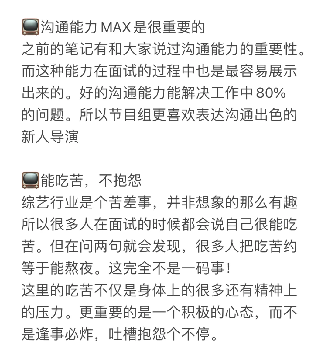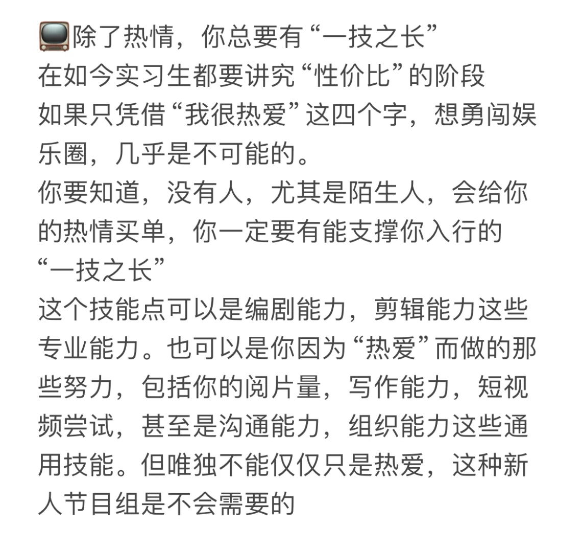 这个技能点可以是编剧能力,剪辑能力这些专业能力也可以是你因为“热爱”而做的那些努力,包括你的阅片量,写作能力,短视频尝试,甚至是沟通能力,组织能力这些通用技能。但唯独不能仅仅只是热爱,这种新人节目组是不会需要的