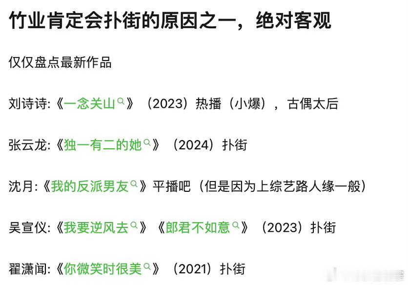 狐妖小红娘竹业篇会扑街的原因之一:除了刘诗诗的一念关山没扑之外,张云龙 周洁琼 孟子义 沈月 吴宣仪等演员上一部都扑了[吃惊]