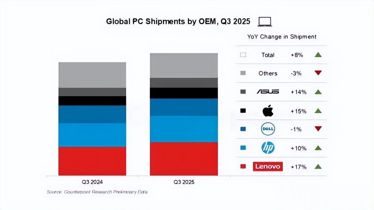 根据 Counterpoint Research 的报告,Windows 10 停服后,苹果 Mac 在2025年第三季度全球出货量同比增长 14.9%,成为 PC 换机潮中的主要受益者之一。这波增长的背后,主要是因为部分用户因设备缺少 TPM 2.0 无法升级 Windows 11 转而投入 Mac 生态,以及部分公司为对冲美国高额进口关税风险提前囤积库存。