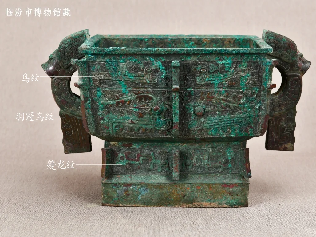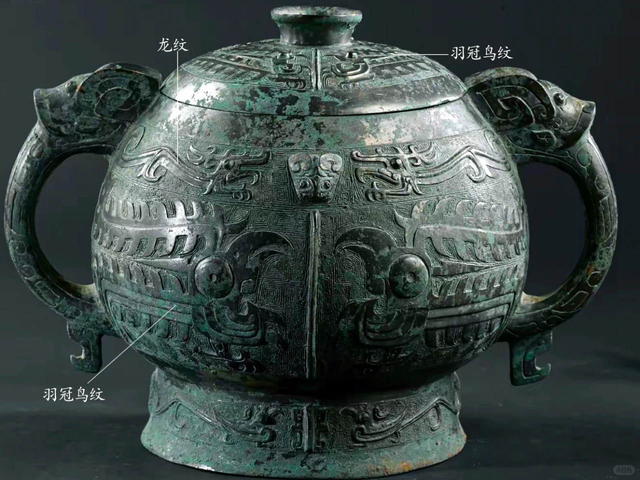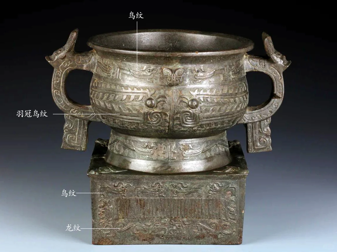 西周早期出现不少这个时期特有的纹饰,“羽冠鸟纹”是一种。 今介绍: “羽冠鸟纹” 。 图二,西周早期,凤鸟纹簋,宝鸡渭滨博物馆藏品。 图三,商代晚期,父乙册方簋,临汾市博物馆藏品。 图四,西周早期,凤鸟纹方座簋,陇县博物馆藏品。 图五,西周早期, 凤鸟纹卣,海昏侯博物馆藏品。 图六,西周晚期,凤鸟纹卣,芮国博物馆藏品。 初步比对, “羽冠鸟纹 “时间大致在西周早期,该纹饰在不同器物上的不同部位而这些器物又分布在不同地区。 初步判断 “羽冠鸟纹 “ 应是西周早期某一氏族(宗)的族徽特有纹饰。