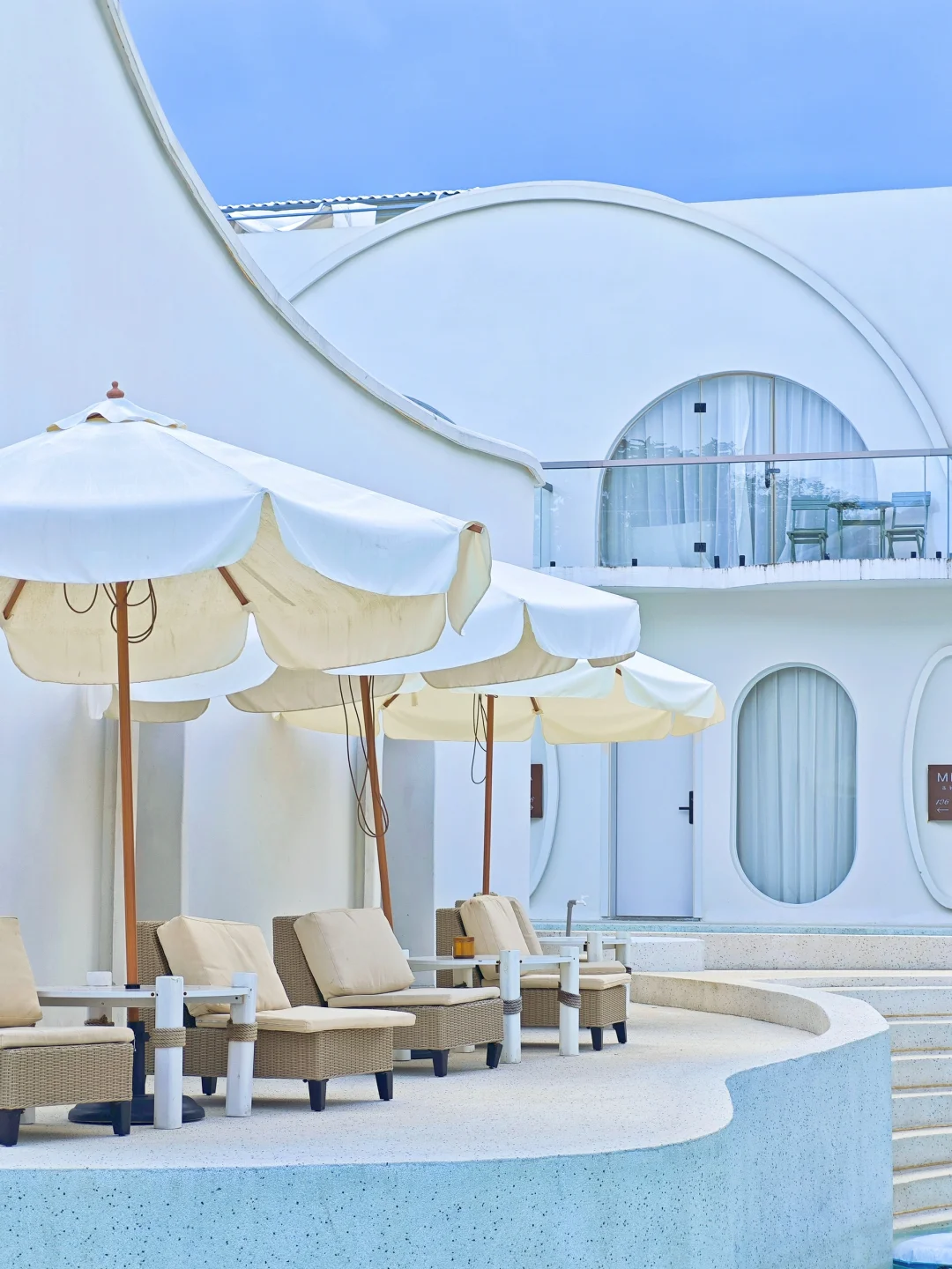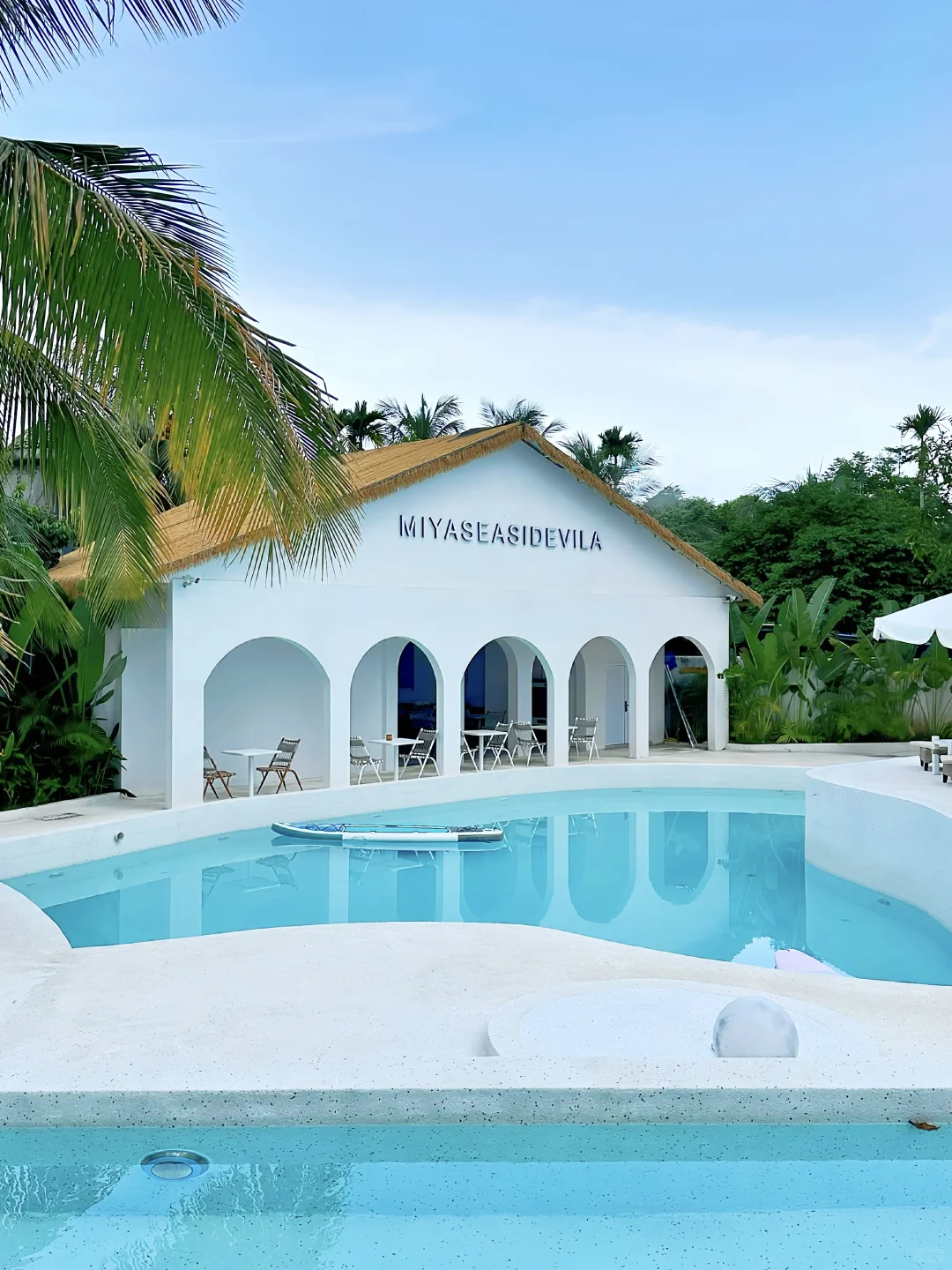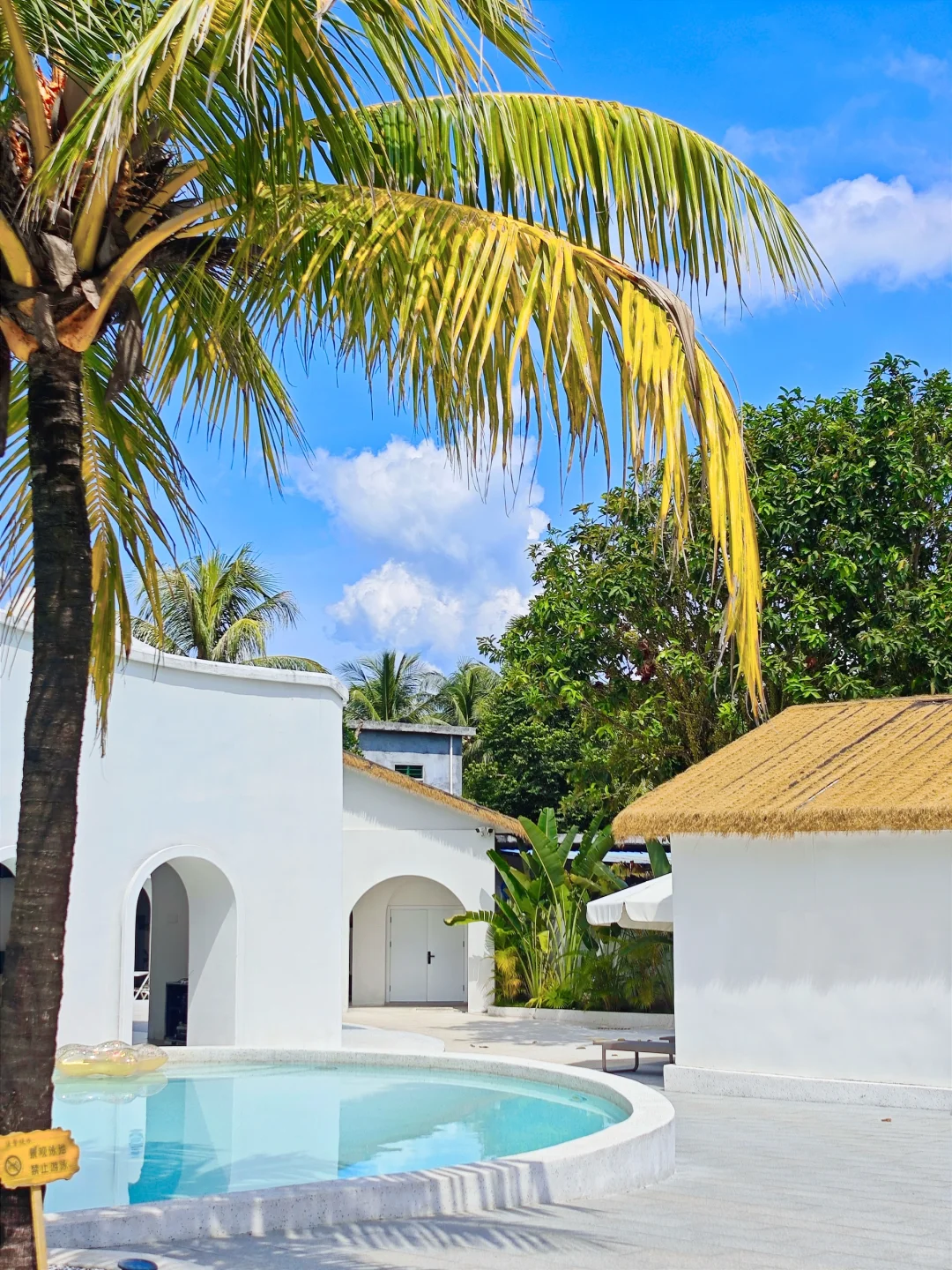 🏖️民宿建筑整体以白色为主,摩洛哥风格设计,蓝色的超大泳池🏊和环绕在院子里的椰树🌴,还有桨板🏄🏻可以玩,累了可以躺在泳池边发呆放空,简直一整个度假感拉满!!