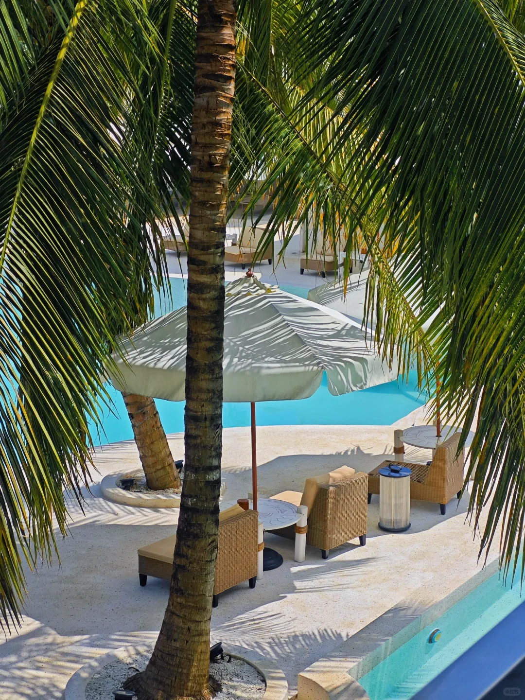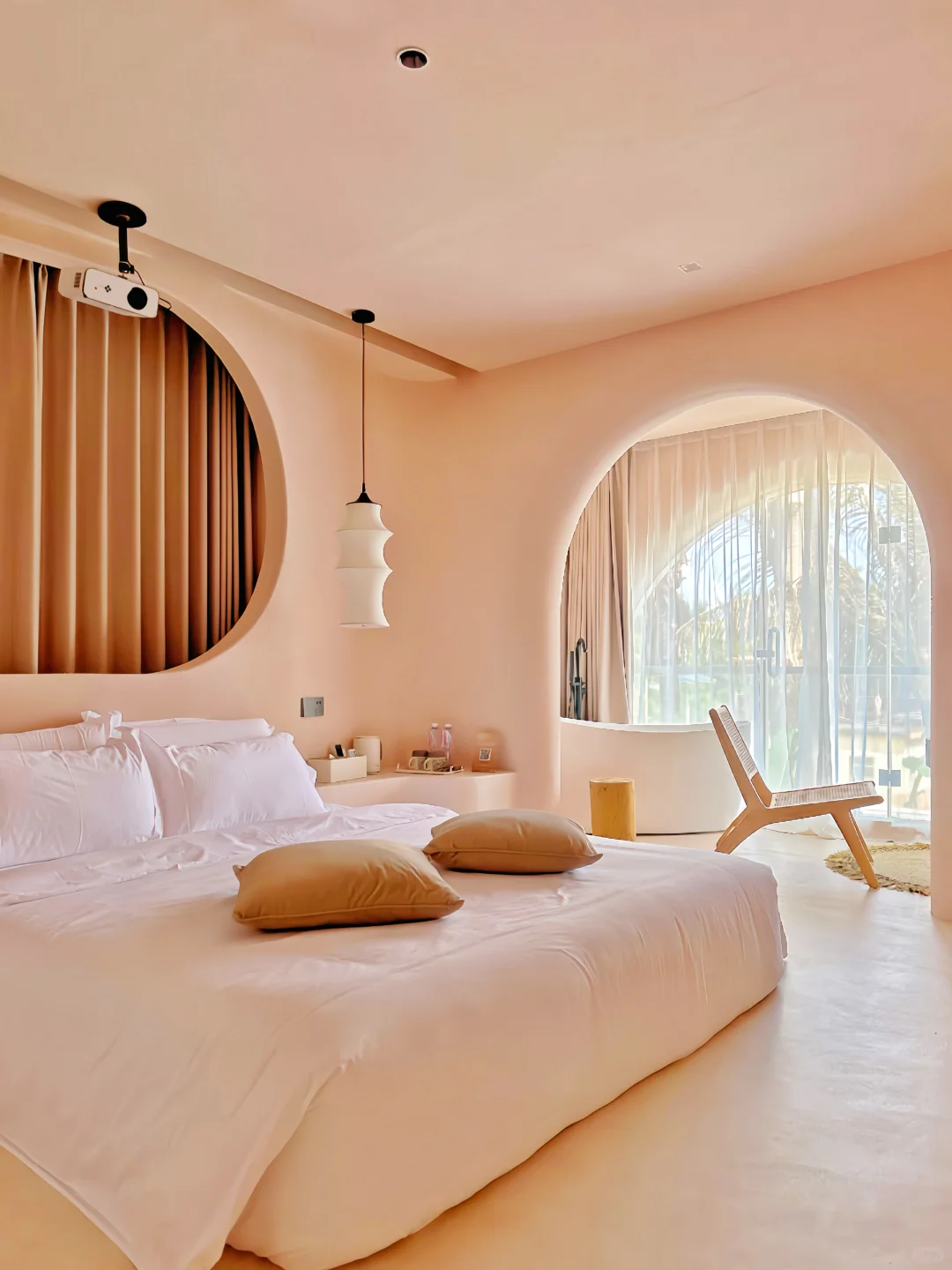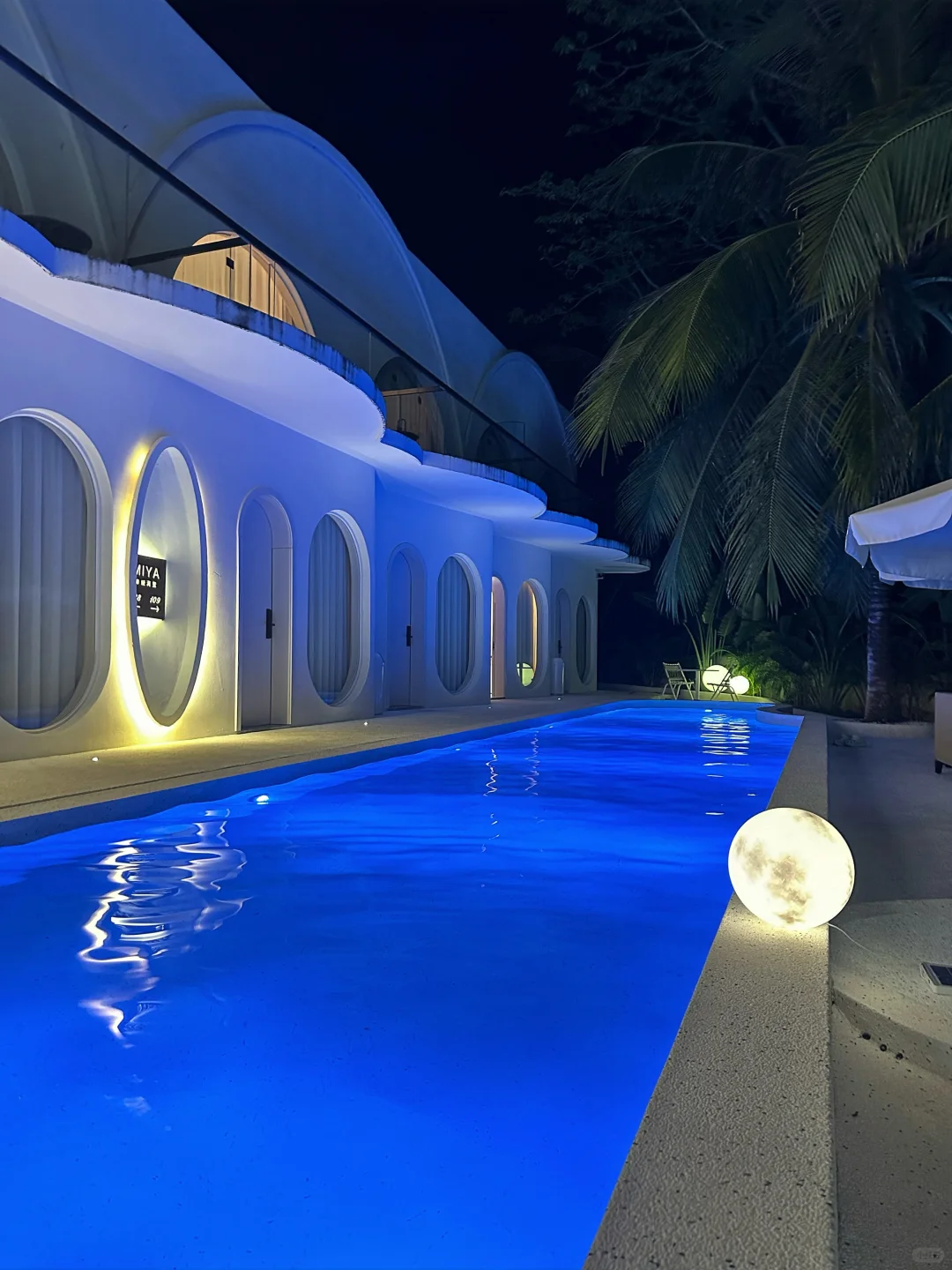 🏖️民宿建筑整体以白色为主,摩洛哥风格设计,蓝色的超大泳池🏊和环绕在院子里的椰树🌴,还有桨板🏄🏻可以玩,累了可以躺在泳池边发呆放空,简直一整个度假感拉满!!