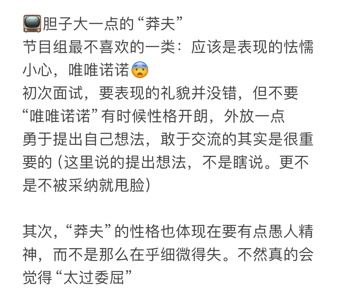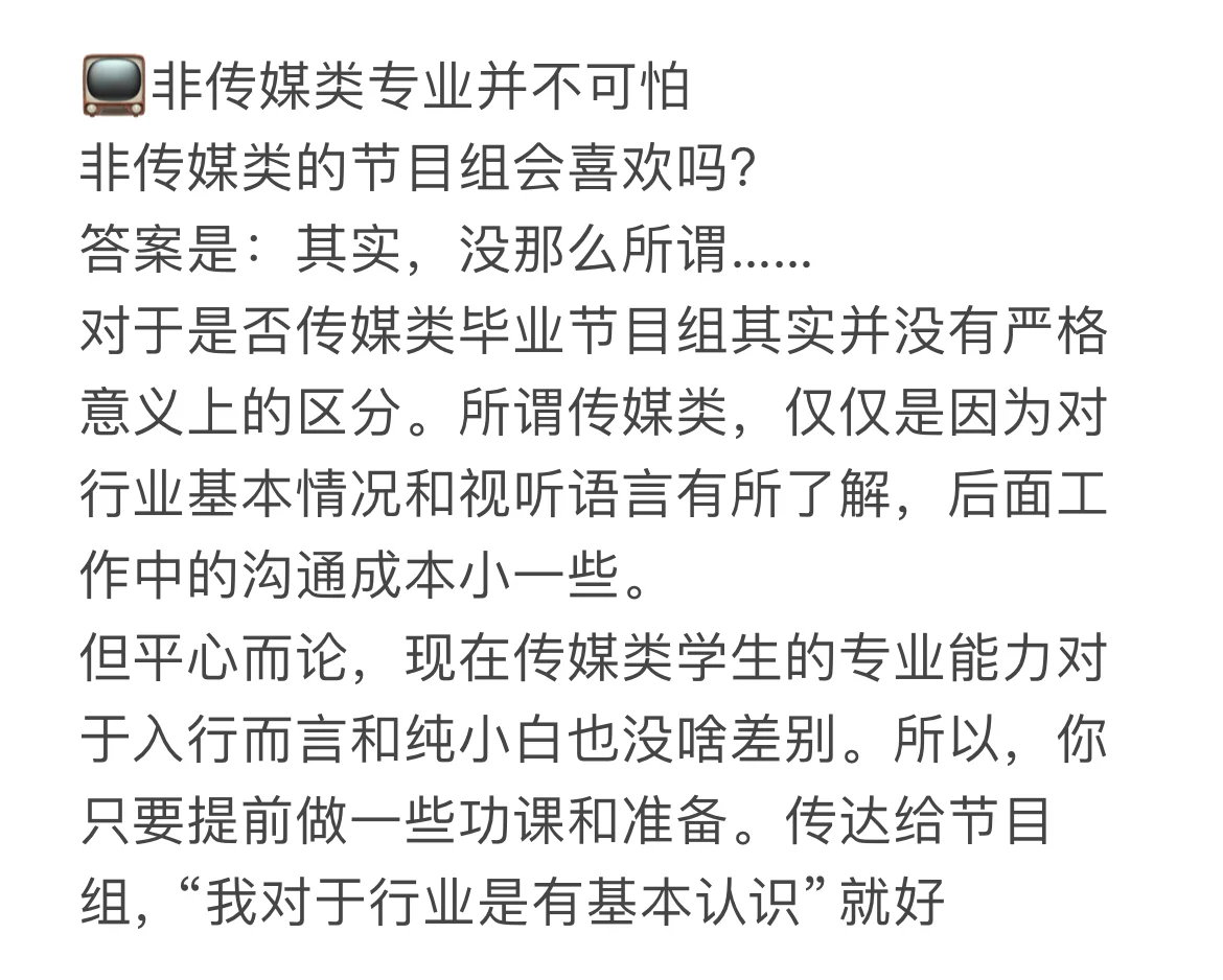 但平心而论,现在传媒类学生的专业能力对于入行而言和纯小白也没啥差别。所以,你只要提前做一些功课和准备。传达给节目组,“我对于行业是有基本认识”就好