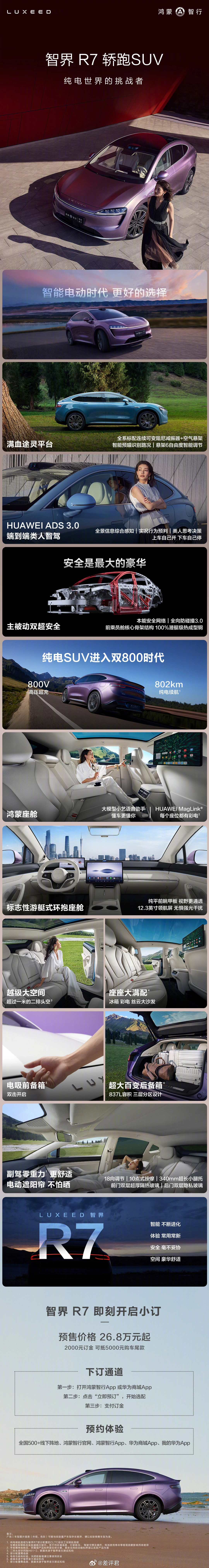 #差评说车#鸿蒙智行首款轿跑 SUV 智界 R7 也正式开启小订了,预售价格 26.8 万元起。之前在成都车展上见过实车,车头导风槽、车尾小鸭尾、21寸大轮毂,外观挺运动的,当时就感觉这车是硬刚 Model Y 来了。