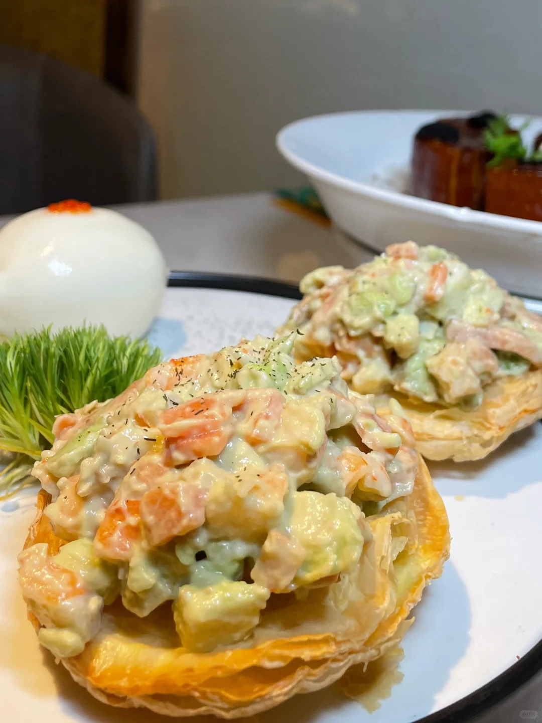 脆崩崩酥皮塔里堆满了牛油果和烟熏味三文鱼,加上饱满的虾仁五湖四海全在嘴里开大会。