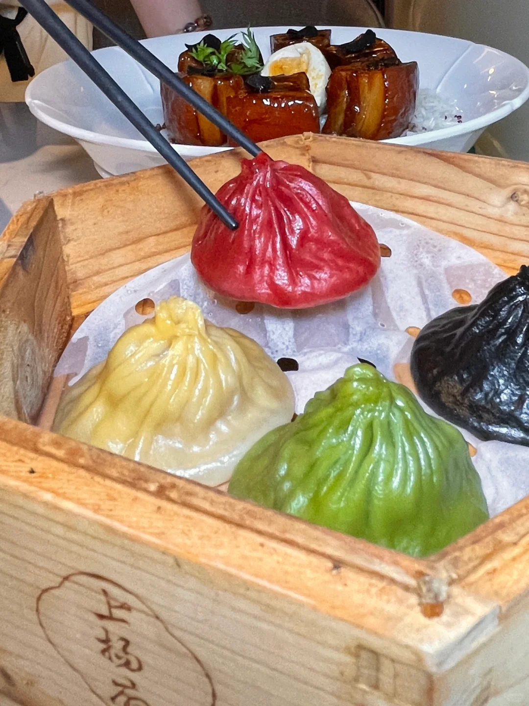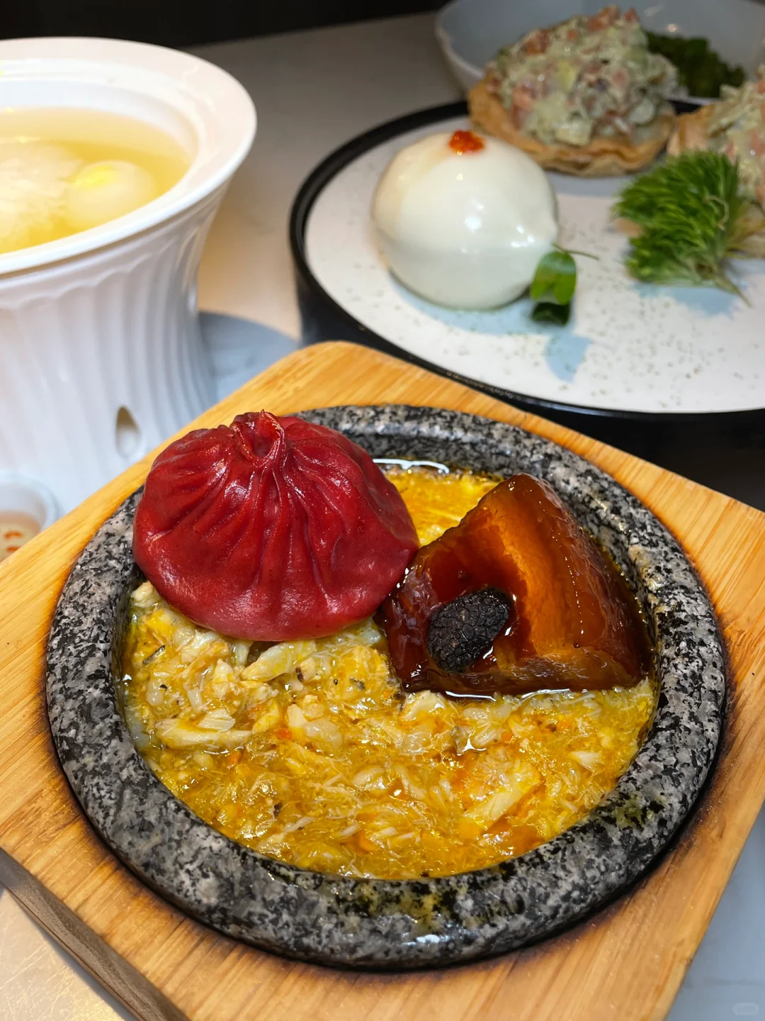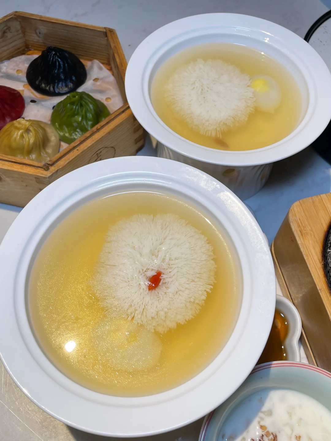小笼包非常创新,有四种馅料:有带子、鲍鱼、虾仁还有一个芝士海螺的,不用担心不搭,依然汤汁醇厚鲜美不减。