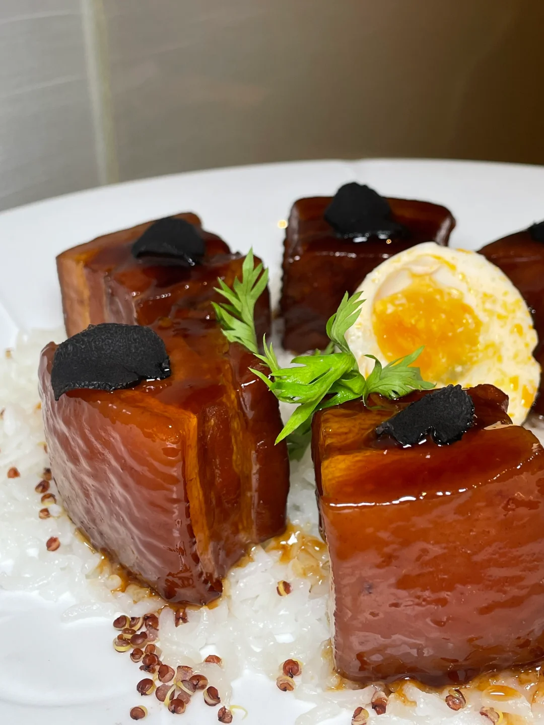 大块的红烧肉晶莹剔透,肥瘦相间一口下去非常过瘾,黑松露的特殊香气和酱油色的汤汁渗透到颗颗分明的米饭里,就更是下饭了