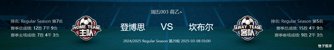 坎布尔本赛季整体表现不俗,目前28轮联赛过后,取得15胜4平9负的战绩,位居荷乙积分榜第5位,已经步入升级附加区内,而且只落后直接升级区4分,全队本场战意也会比较强烈。上轮联赛主场5-0狂胜芬洛,球队近8轮联赛取得了5胜2平1负的不俗战绩,期间进攻端表现突出,场均打入2.13球。而且球队本赛季联赛客场战斗力十分强势,目前14个联赛客场取得9胜2平3负的战绩,期间场均打入2球失0.93球,客场实力排名荷乙联赛首位。