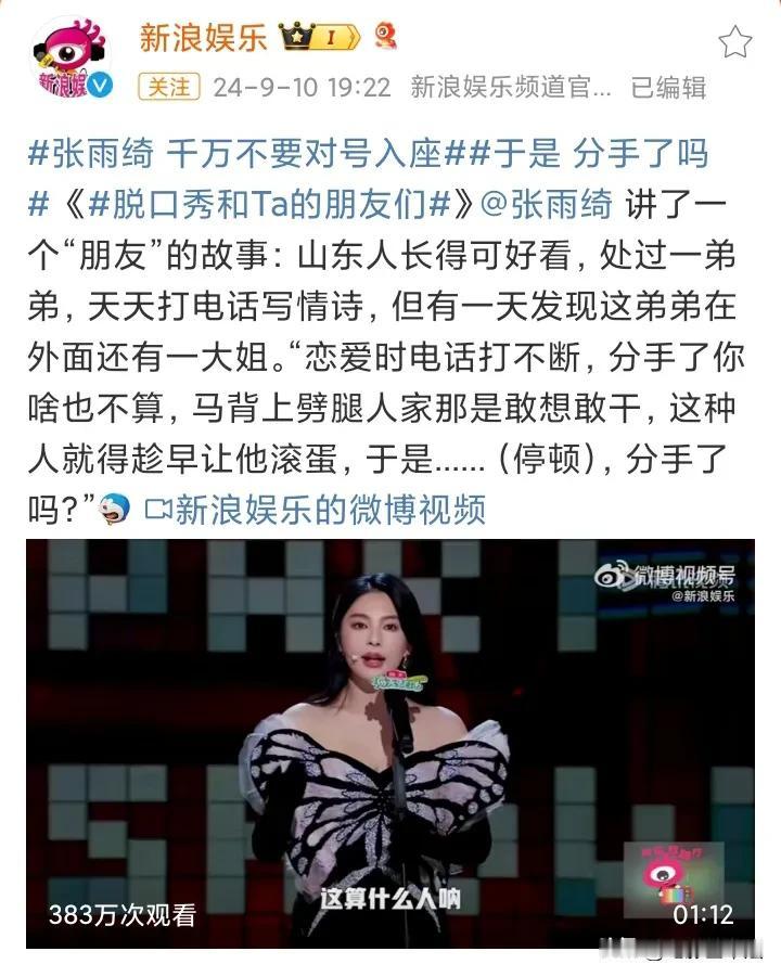 张雨绮,评论区沦陷了! 9月10日,张雨绮内涵于适劈腿冲上热搜,根据她在脱口秀的爆料,于适在和她交往期间劈腿,事后称她为二姐,而劈腿对象为大姐。 本以为大部分人都会支持张雨绮,没想到评论区有很多与想象不一样的声音,他们不觉得这算事或者反对张雨绮: 娱乐圈,谁也不要嫌弃谁。 娱乐圈嘛,进进出出很正常。 张雨绮是真懂脱口秀的。 你以为你是玩家,其实对方也是玩家,你以为你是以旧换新,其实对方也是以旧换新。 她自己的瓜更多。 张雨绮蹭热度而已。 结婚几次离婚几次,男朋友无数,谁是什么大家又不是不知道。 心狠到做局干倒王导,为了流量和小鲜肉炒CP。 我觉得张雨绮是真的没未来了。 娱乐圈这种也算瓜? …… 不能确定事情真假,只能说张雨绮是懂流量的,但是也把于适至于尴尬之中,于适回不回应都会非常尴尬,不清楚张雨绮这么做的真正动机,只想问,在娱乐圈要想做到洁身自好,真的那么难吗? #寻找热爱表达的你#