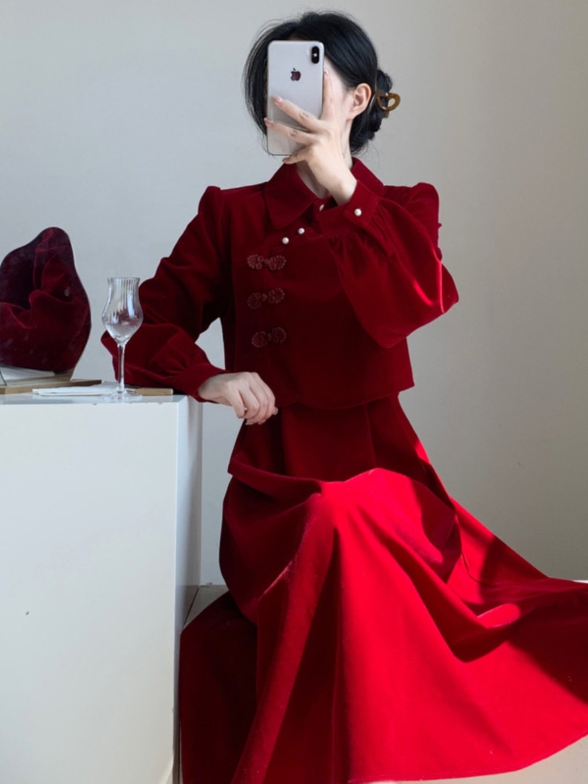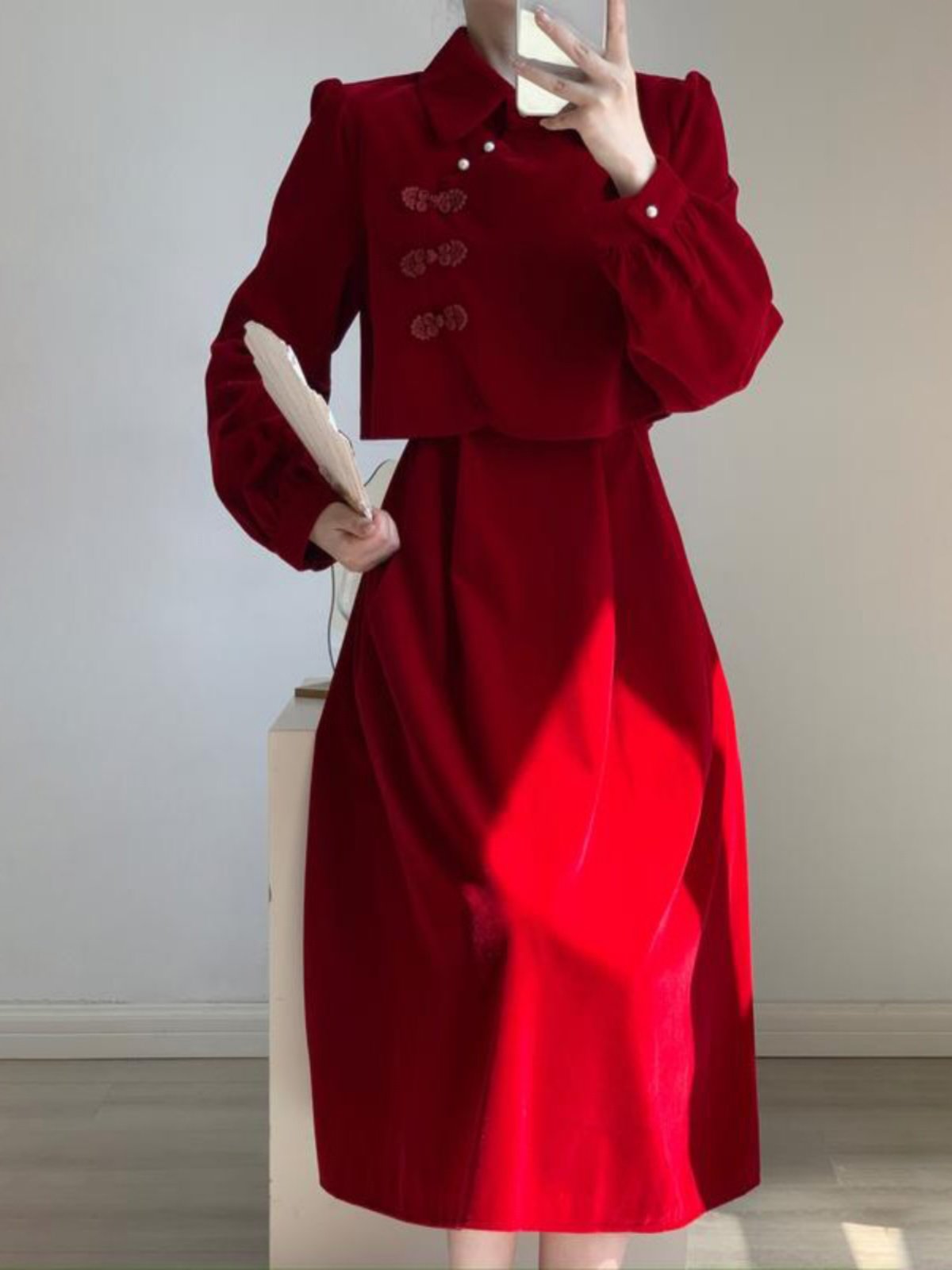 新中式国风改良旗袍红色丝绒连衣裙女