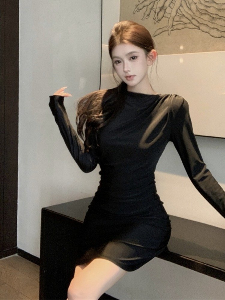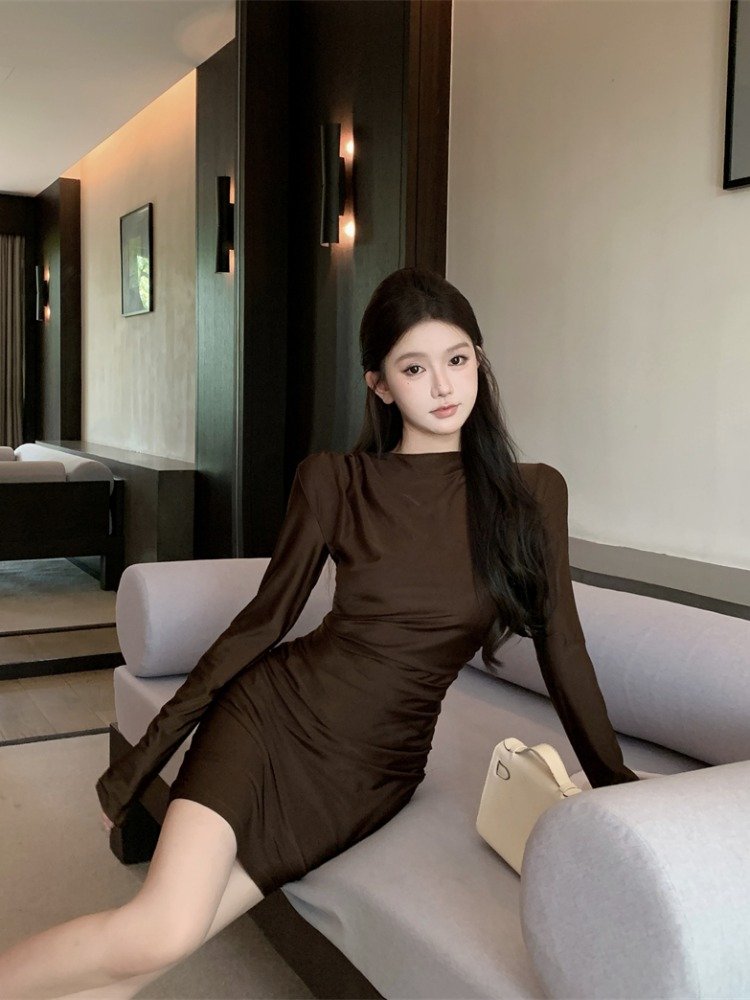 纯欲风辣妹玫红色长袖连衣裙女
