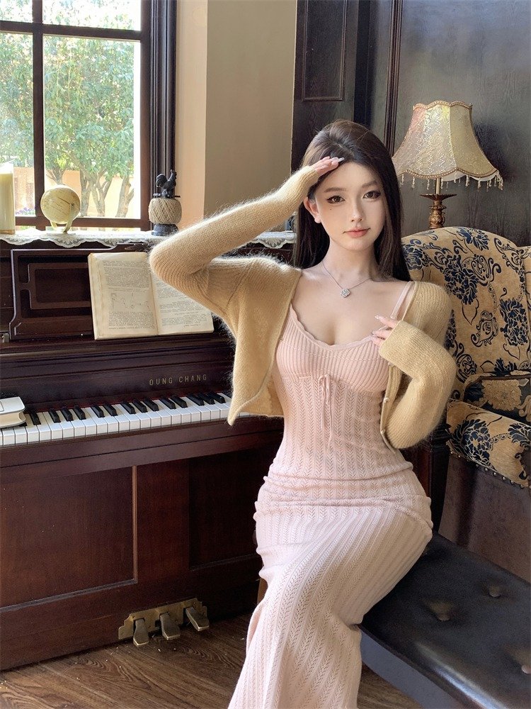 法式气质蓝色针织吊带连衣裙早秋