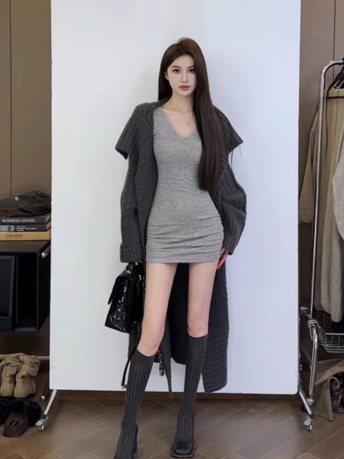 纯欲性感v领长袖连衣裙女秋装
