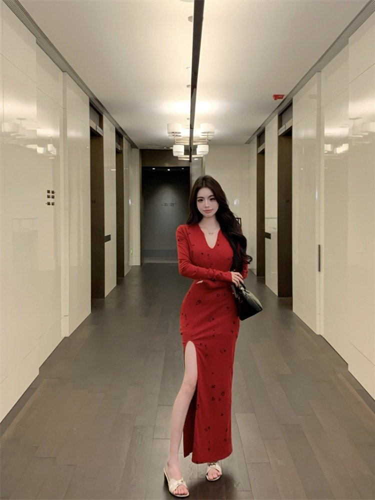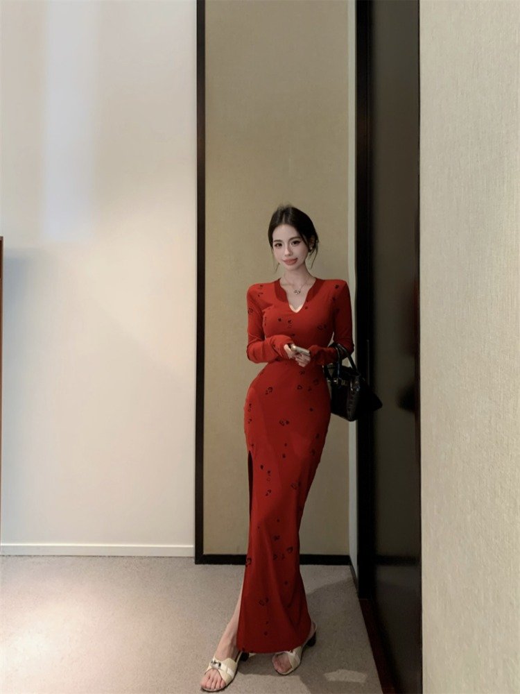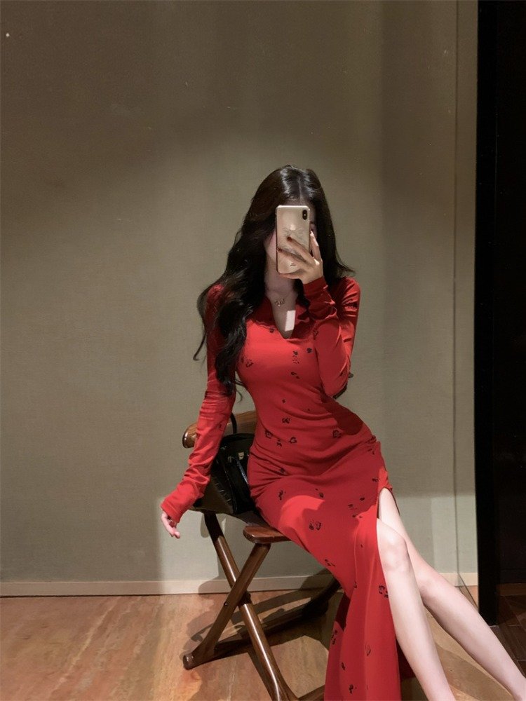 法式气质红色V领长袖连衣裙女早秋