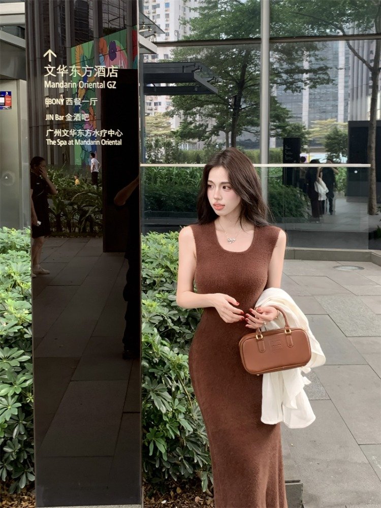 法式气质咖色针织背心连衣裙女