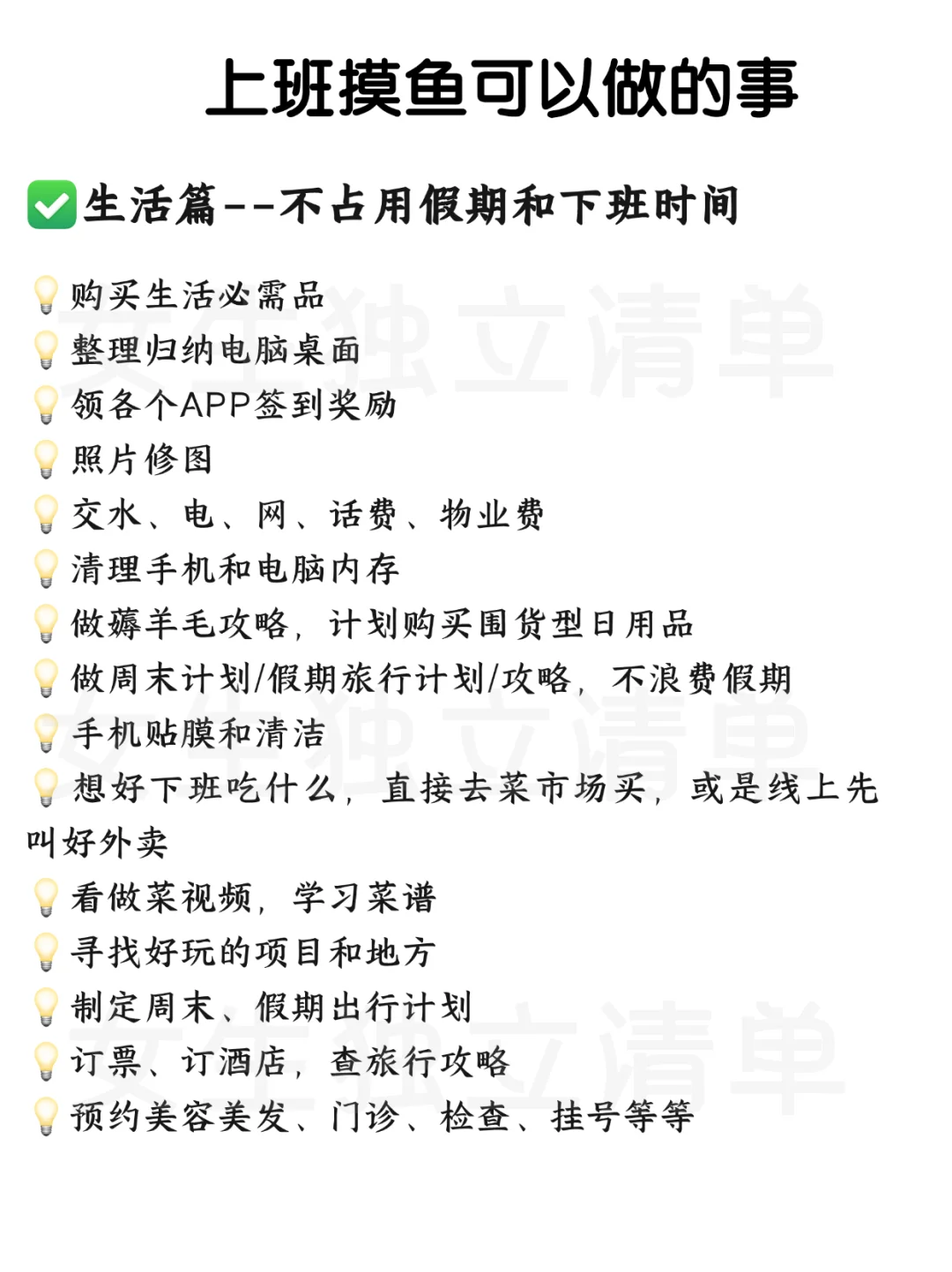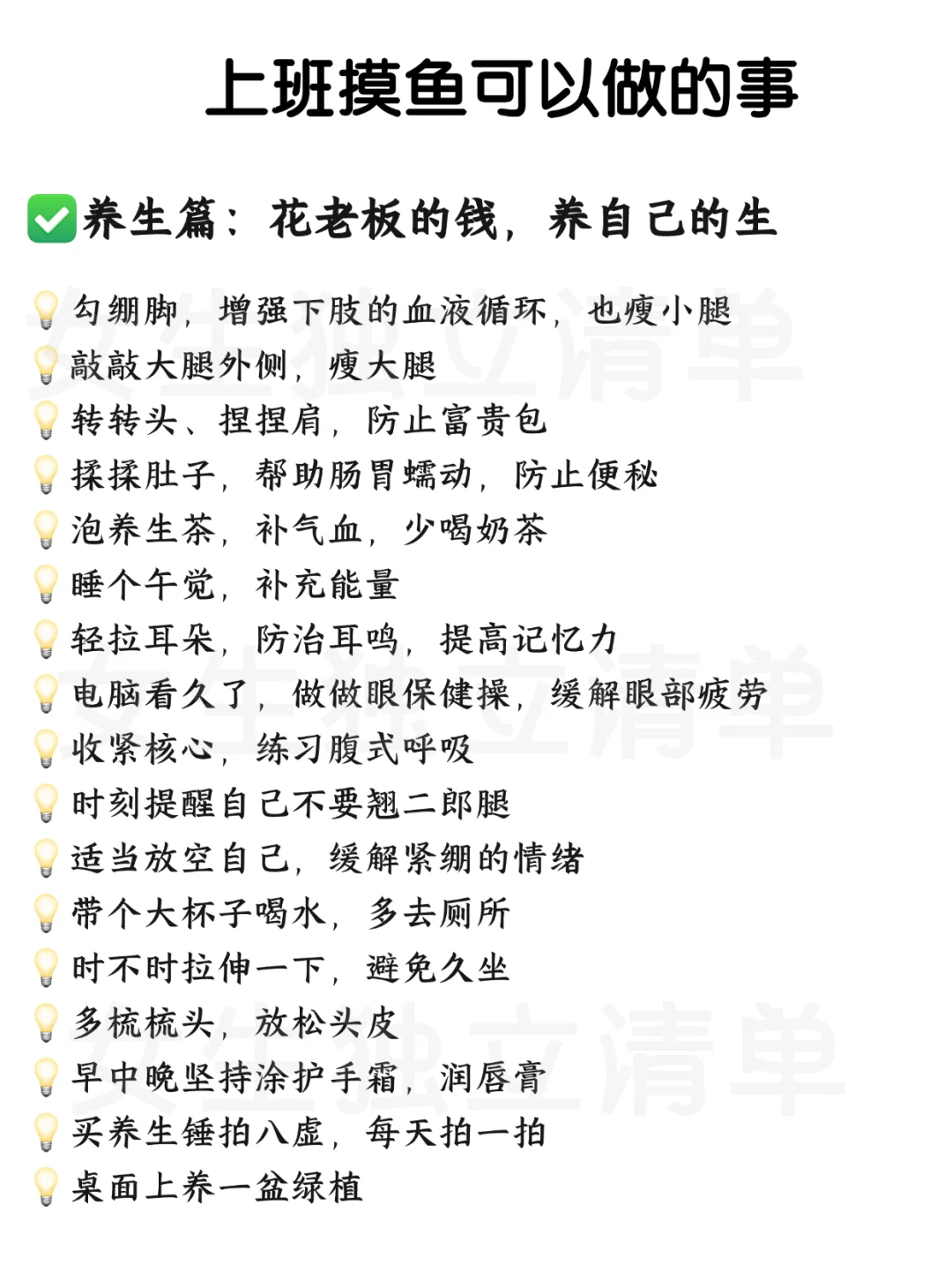 上班而已,千万别太内耗,工作只是生活的一部分,不要把工作看的过于重要,😁适度的休息和放松(摸鱼)对提高工作效率和保持工作热情是有益的哦~还能提升自我呢! ✅上班时把这些事做完,既提升了自己,又充实了工作时间,➡️➡️每天告诉自己:我真的很喜欢上班!我真的很喜欢上班!我真的很喜欢上班! ✔️我可以带薪拉屎 ✔️我可以免费喝水 ✔️我可以给家里省水省电 ✔️上班就有吃不完的瓜 ✔️老板的PUA可以让我锻炼的我的意志! ....想不到了,姐妹们还有补充的留言哦~~ 👭姐妹们,学会了吗?