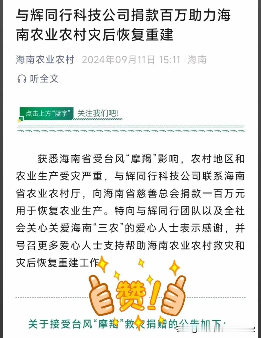 就在刚刚,与辉同行(北京)科技有限公司捐款百万元人民币的善款,助力海南省受灾地区的农民,开展灾后重建工程!点赞👍宇辉同行!