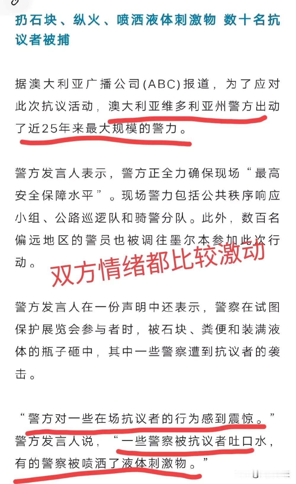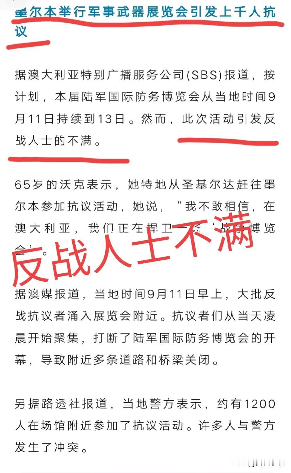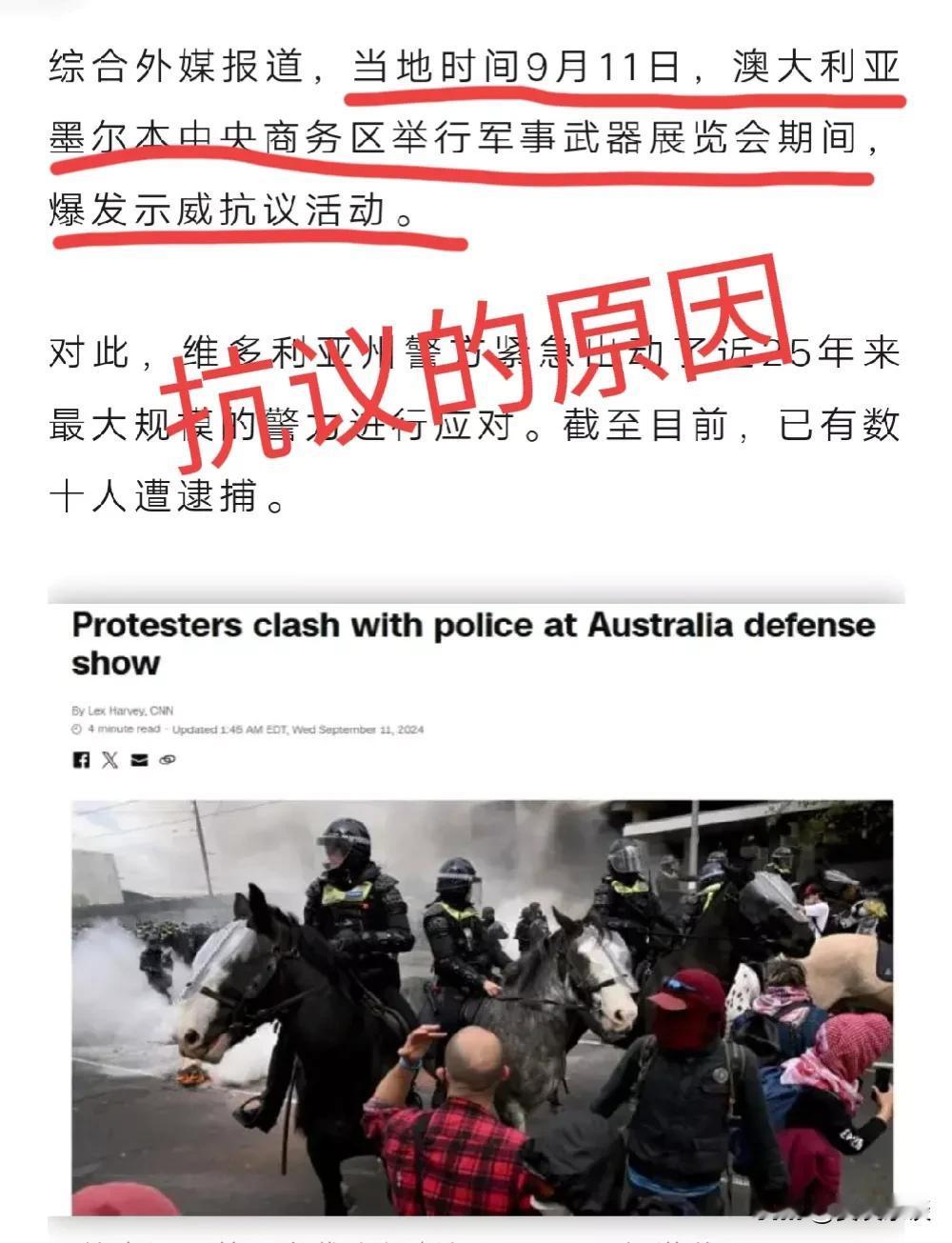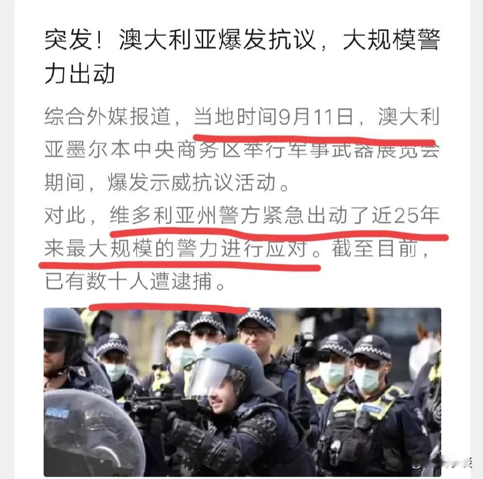 刚刚看到这则标题为《澳大利亚爆发抗议大规模警力出动》的消息,太让人震撼了。 当地时间9月11日,澳大利亚墨尔本中央商务区举行军事武器展览会期间,爆发示威抗议活动。 这给全球释放了一个什么样的信号,澳大利亚是要发起战争吗? 这些抗议者又为什么要对中央商务区举行的军事武器展览抗议呢? 这些抗议者会得到澳大利亚的善待吗? 战争会给民众带来无尽的灾难和困苦,希望世界不要战争,和平共处,世界大同,全球生辉。
