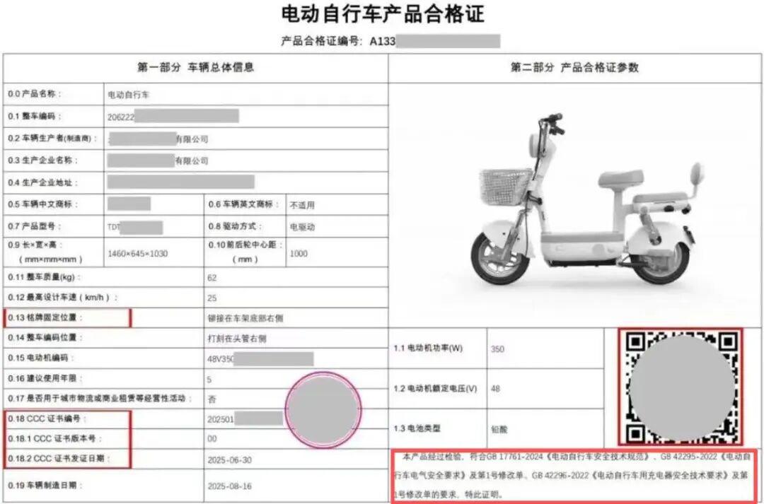在去年11月,相关部门就对电动自行车认证进行了更新,合格证下方除了要有《电动自行车安全技术规范》GB17761-2018或2024以外,还要有《电动自行车用充电器安全技术要求》GB42296-2022、《电动自行车电气安全要求》GB42295-2022。这三个是必须检查的,但如果是锂电车型,还要符合《电动自行车用锂离子蓄电池安全技术规范》GB43854-2024。