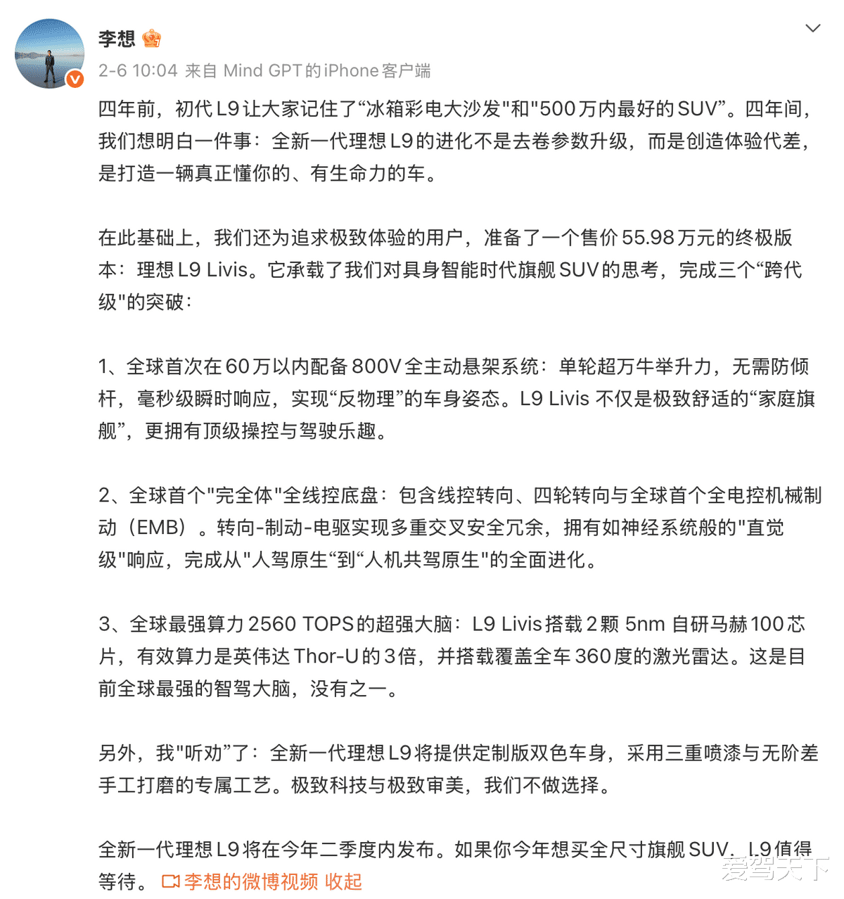然而,全新一代理想L9 Livis最大的变化在于技术“堆料”与定位升级。于是,全新一代理想L9 Livis开始了新的身份——具身智能机器人。新车几乎集齐了当前主流前沿技术:800V全主动悬架系统、含线控转向与四轮转向的“全线控底盘”、算力高达2560TOPS的双颗自研马赫100芯片。理想试图通过这些硬核参数,打造出李想所称的“体验代差”。不出意外的话,此前L9常被吐槽的“开大船”体验、滤震差、辅助驾驶系统不稳定等问题,应该能得到解决了吧!