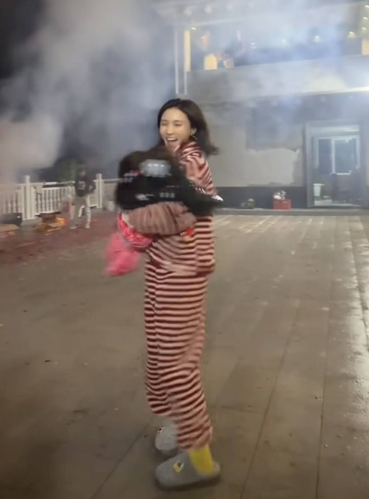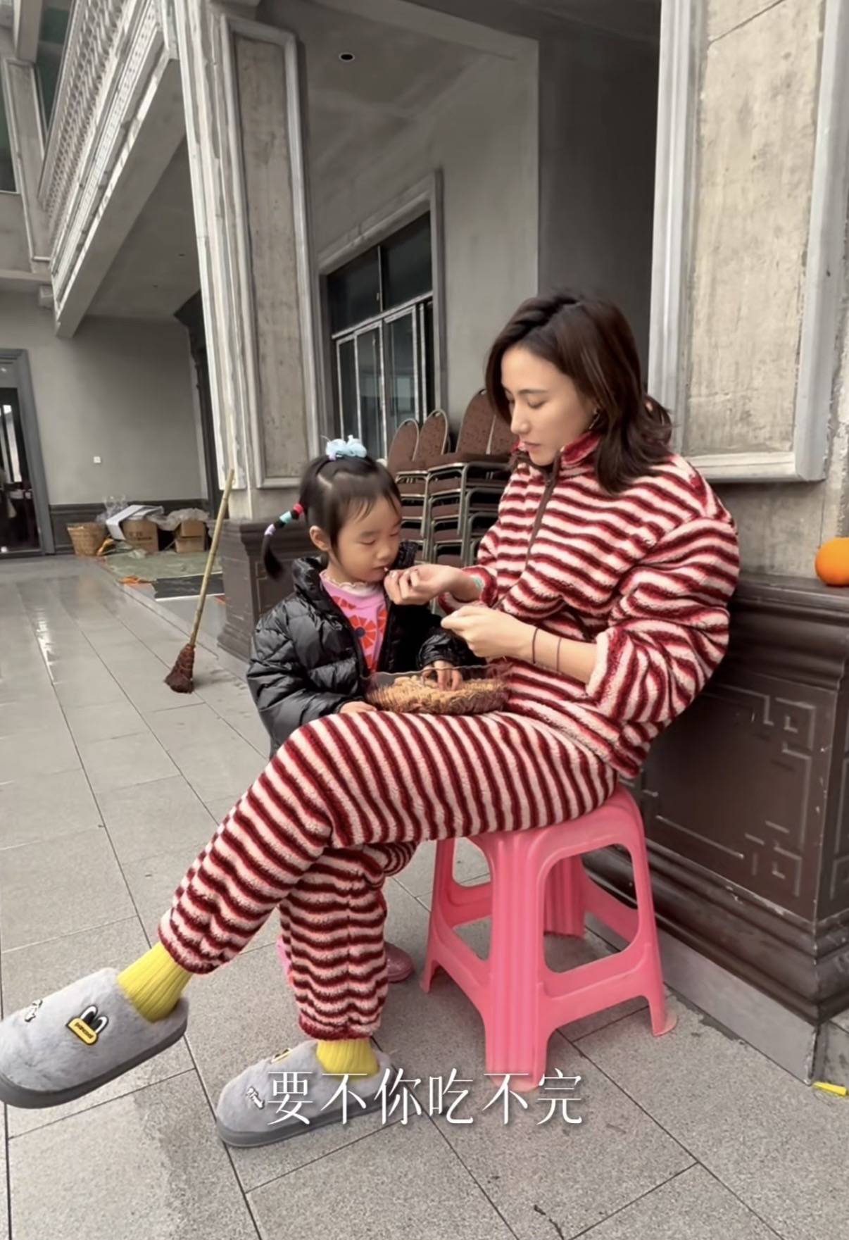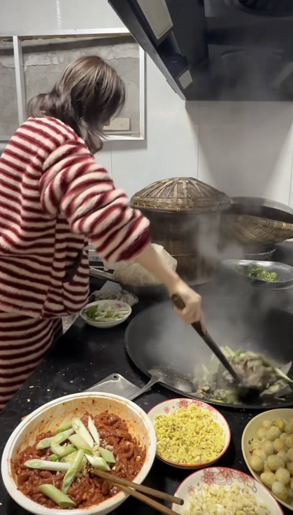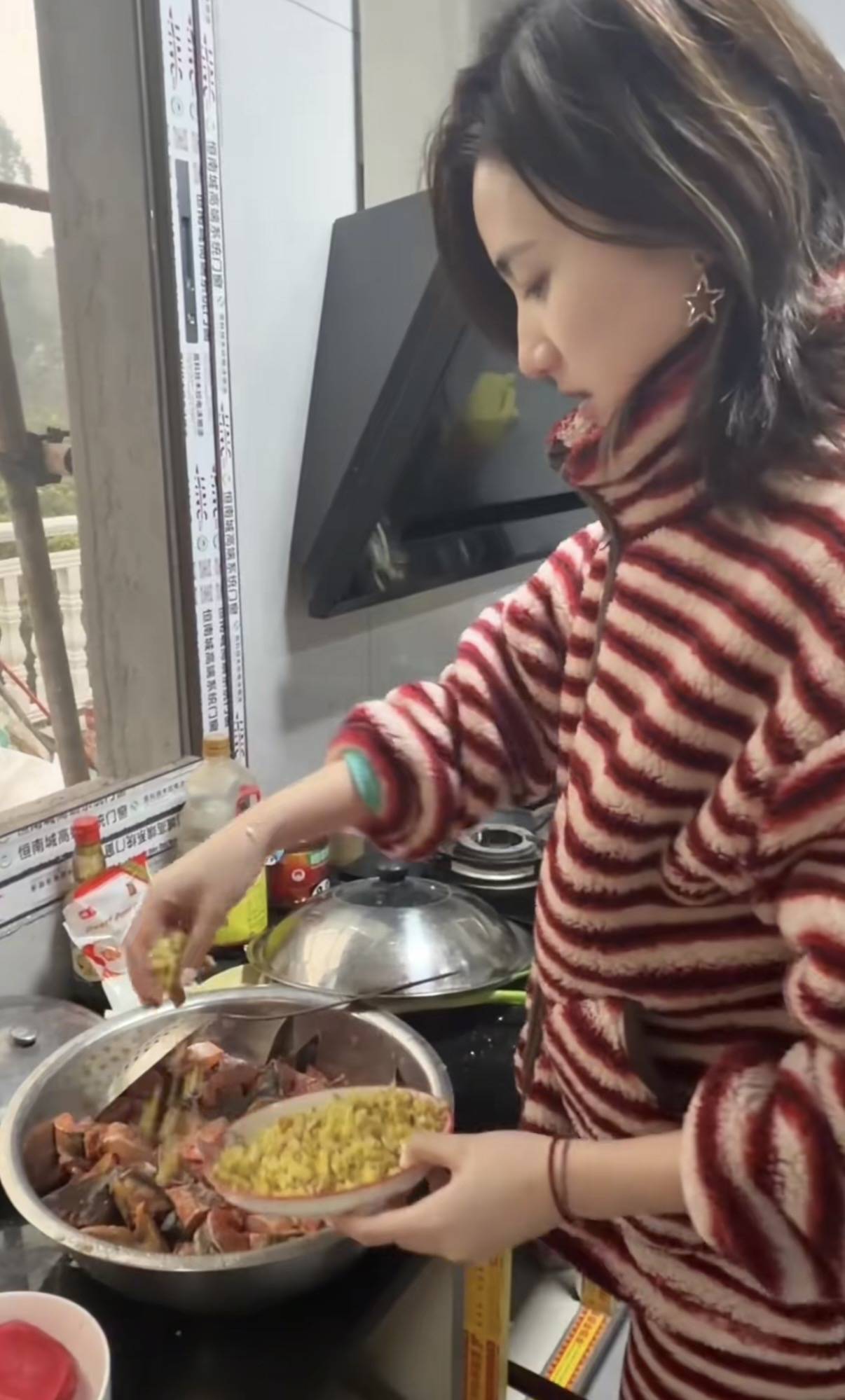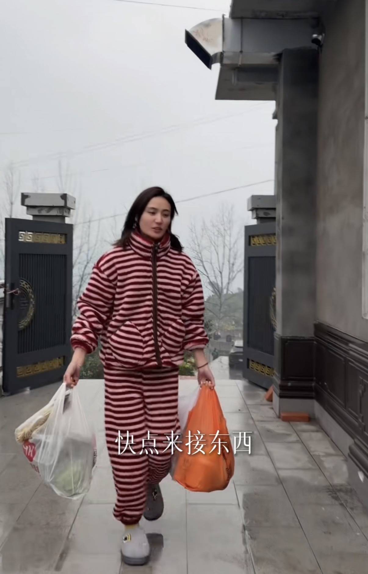她穿一身红白条纹的毛绒睡衣,完全没有大网红的架子。出门买菜回来,一个人手里拎着2大袋子食材,真的是超能干。