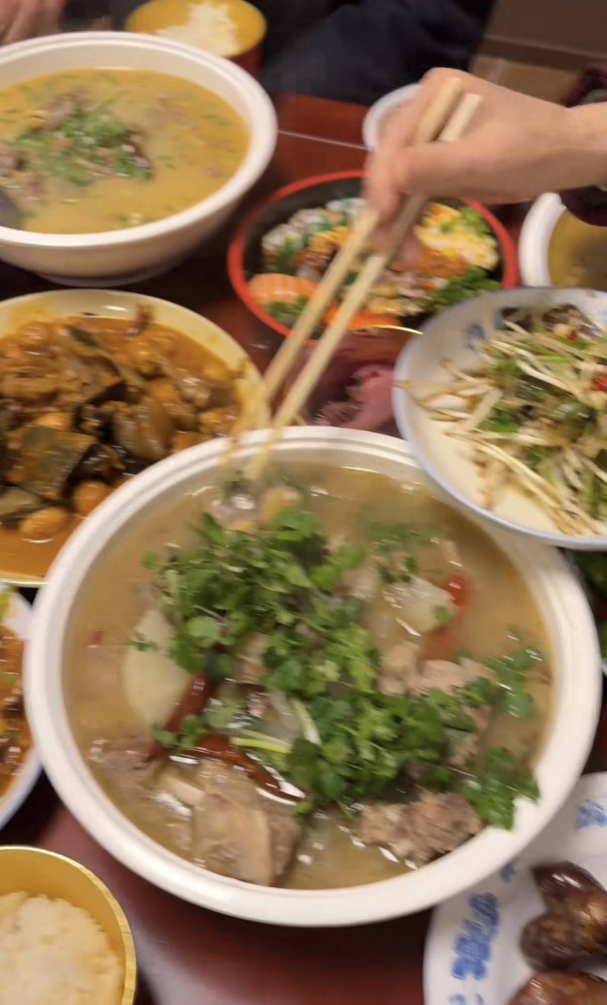 镜头一扫而过,这桌年夜饭真的是特别丰盛。有肉有菜有汤,每一桌都是十几个菜,还有灵魂菜品折耳根,这一桌年夜饭,妥妥的四川味道。