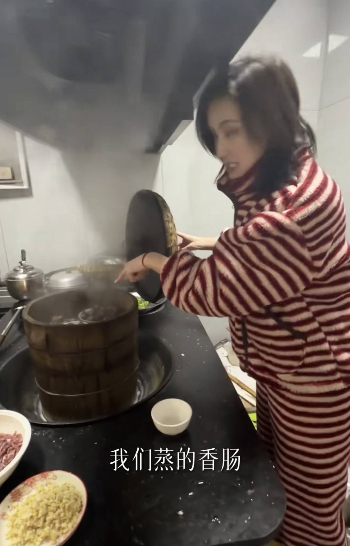 金喜还向网友展示了自己做的菜,锅里蒸的是腊香肠、腊排骨,这是特色的地方味道,也只有在四川能吃到这么正宗的蒸香肠、蒸排骨。