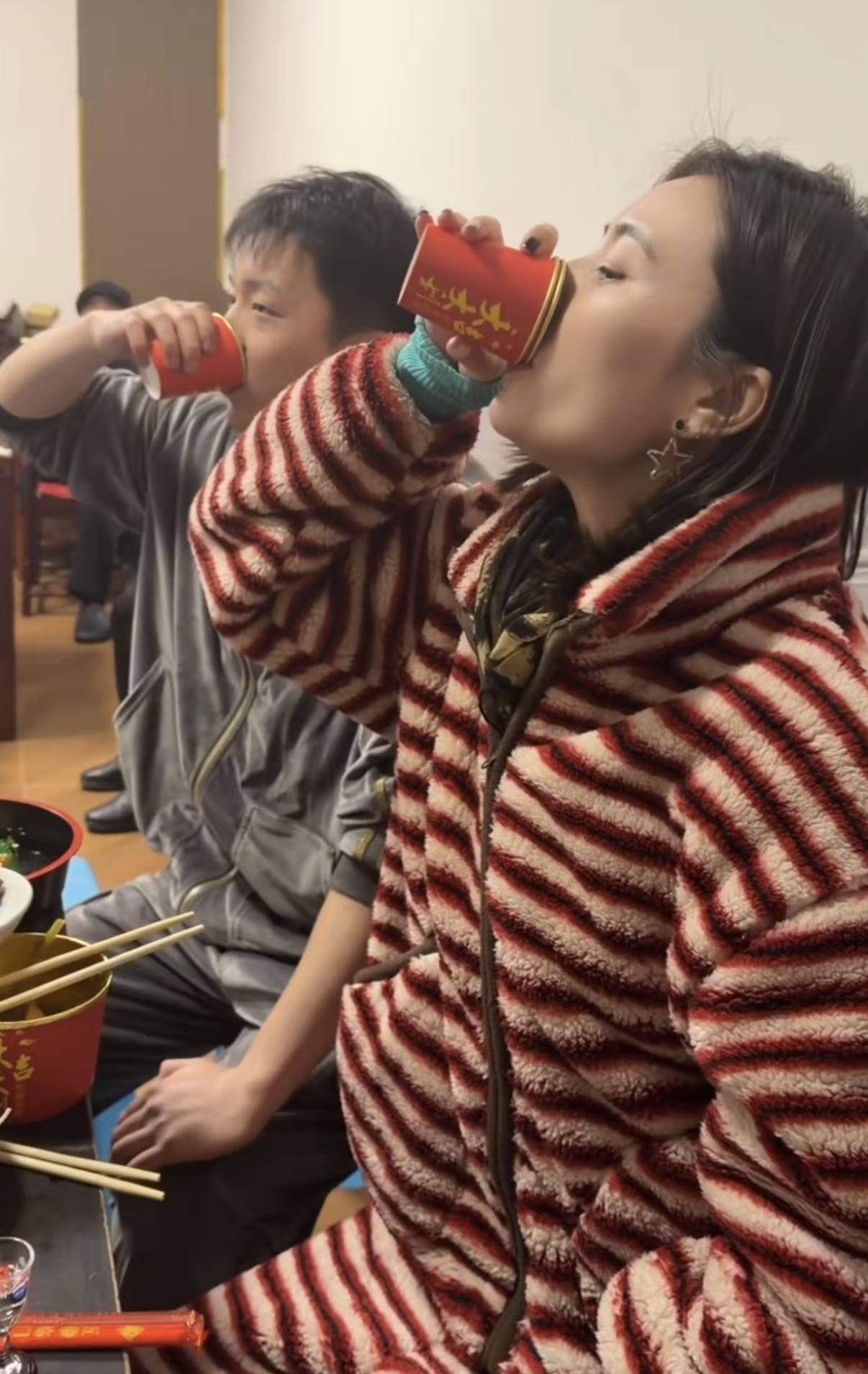 大家举杯痛饮,共庆佳节。金喜也真是挺豪放的,她和大家一起干杯,坐在她身边的是一个小男孩,看着年纪不大、长得倒是挺帅气的。