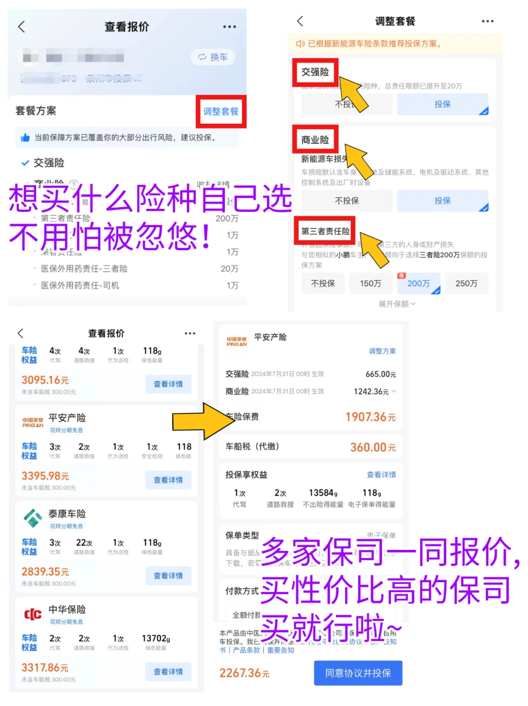 前几天车险快到期,找之前的业务员打听价格,他给我推荐了几个他嘴里很有必要的险种,我上网查了一下,发现有些根本没必要买‼️找他确认但被告知不买这几个附加险,😳就不能买其他商业险,还好我通过朋友了解到线上也能购买,而且可以自己调整车险方案,差点就被忽悠多花了大几百💰 😁朋友一直在蚂蚁保上购买车险,省时省力。我之前有听说过线上能买车险,一直觉得不靠谱。✔️她说是支付宝平台的,我就放心了,毕竟是大平台。 ➡️按照流程下来,我发现比找业务员比价省了不少时间。➡️支付宝搜索车险,输入自己的车辆信息,就有10+家保险公司可以一键比,➡️比价格、比服务、比理赔,像有的保司看女生不太懂保险,会让我们买一些平时用不到的险种,✔️蚂蚁保车险可以按照我们自己的实际需求选择险种,不用担心被捆绑销售。 ⚠️如果路上发生事故,蚂蚁保车险也能一键报案,点击“一键报案”,10秒响应,3分钟分配专员,线上就能完成理赔,售后服务都是和线下一样的~ ➡️➡️险种我也做了攻略,主要分为两大类:交强险和商业险 ✅交强险是国家强制购买的险种,赔付给对方车辆,保费价格为6座以下950元,6座以上1100元。没出险来年保费下浮10%,只出险一次不涨, ➡️➡️商业险分为三种 ✅三者险,赔对方的车和人,交强险不够赔的时候就要用三者险,新手推荐300万💰保额,假如撞上豪车一般也足够赔付。 ✅车损险:保额根据车身的价值而定,出事故修自己的车,车因为事故、自然灾害受损,或者被盗抢的,保险公司可以赔偿你的损失✔️ ✅驾乘险:属于意外险,出险不会影响商业险保费上涨,而且无论事故责任方是谁,只要是车上的人,都能获得赔偿,✔️驾乘险座位险性价比高,座位险的赔付责任到人,且出险了商业险保费会涨。 ✅医保外用药责任险 三者险的附加险种,低保费高保额的小险种,比如三者买300万💰,医保外保额最高能买300万的10%,是30万,对于医疗费中有些进口药自费药的报销,省得自己买单~ 👭姐妹们学会了吗?车险快到期去蚂蚁保车险先查看下报价,多了解市场报价,总不会吃亏~ 本产品由安盛天平、太平保险、天安财险、中华保险、太平洋产险、中国人寿、人保财险、大地保险、平安产险、阳光财险、浙商财险、泰康车险、众安保险承保 具体费率及保单金额以实际为准