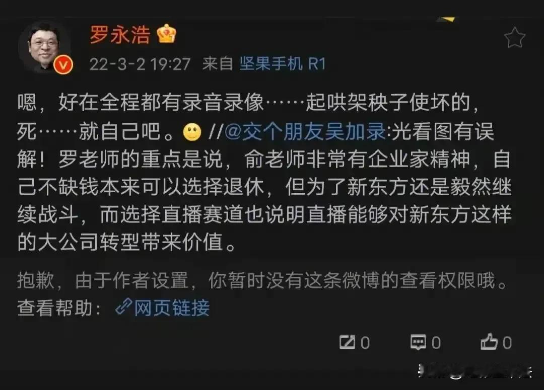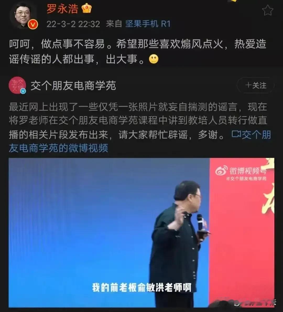 当老鼠嘲笑猫的时候,它身边必然有个洞;当一个人突然冷落你的时候,他身边必然有条狗。 罗永浩虽然名气大口才好,但每次创业都虎头蛇尾,最终负债累累,虽然从新东方离职多年,但是对俞敏洪一直很感激,在交个朋友电商学苑讲课时曾经多次称赞俞敏洪老师非常有企业家精神,自己不缺钱本来可以选择退休,但是为了新东方毅然战斗,这时候的他虽然对俞敏洪确实有一点点不满,但在俞敏洪面前就像老鼠见了猫一样乖。 直到东方甄选爆红并挖走了交个朋友的运营总监以后,罗永浩开始疯狂的大肆讽刺、挖苦俞敏洪(虽然俞敏洪从不理会他,但他依然乐此不彼)。罗永浩作为一个巨债还没还清的人,怎么敢得罪同行业业界大佬呢,他的“洞”和“狗”又在哪里呢?看遍了他的朋友圈,因为他基本上把投行圈都得罪了一遍,所以有能力且还有意愿帮他的投资人,看来看去只有冯唐一个。 冯唐为人我并不了解,但是我在央视主持人柴静的《杂种冯唐》里看到这么一段形容,柴静说,冯唐有一半的朋友觉得冯唐太阴,这一半朋友在出席公众场合时连冯唐的名字都不想提。#寻找热爱表达的你#