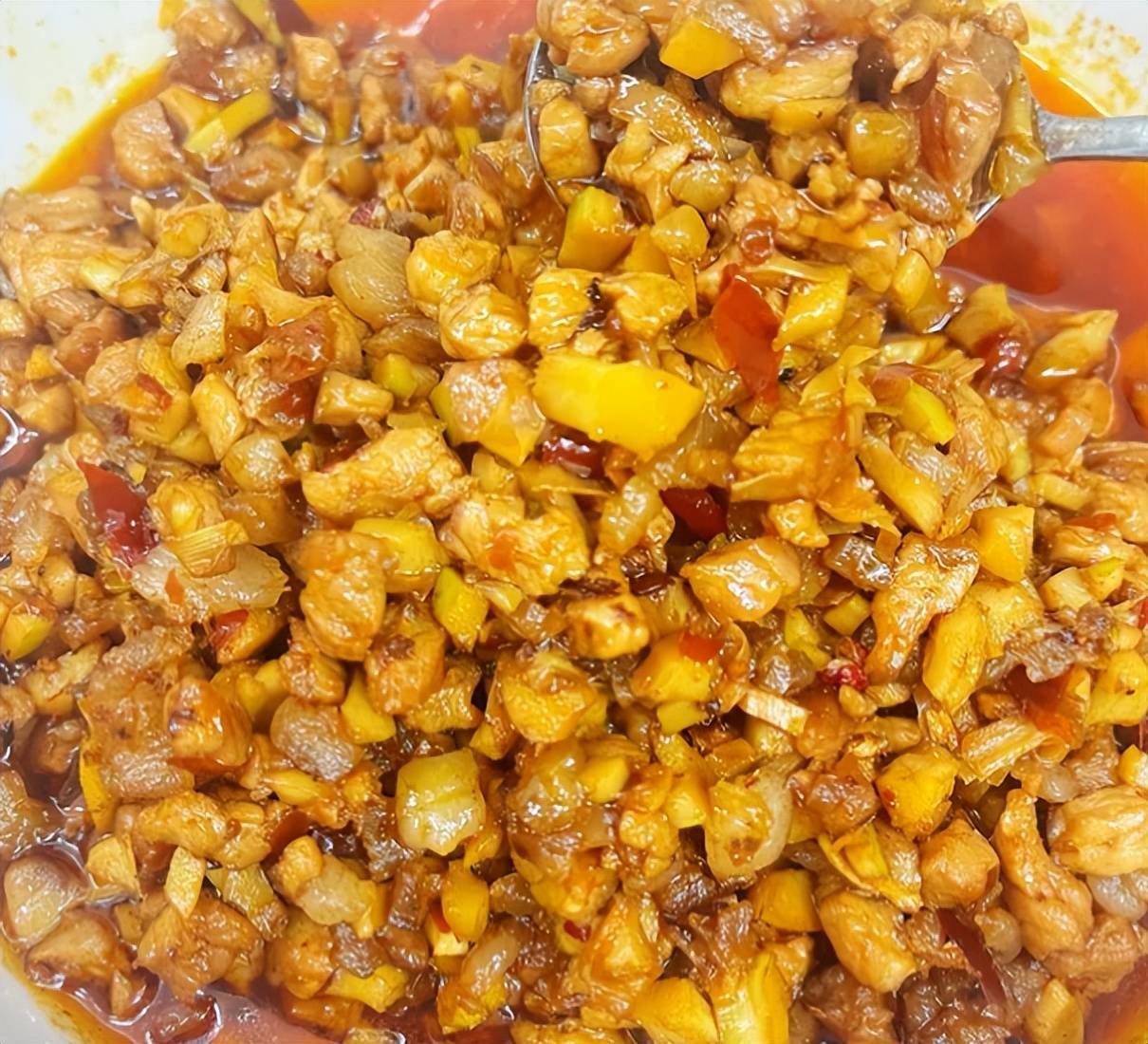 热锅之后,先下足量的食用油,油温升起时放入肉丁,用中火耐心煸炒,直到肉色转白,油脂微微渗出,散发出浓郁的焦香。这时将姜末、蒜末和辣椒碎倒入锅中,与肉丁一同翻炒,辛辣的香气被热油激发,扑面而来。接着把切成均匀小粒的笋丁倾入,继续翻炒,让笋丁充分吸收锅中的油脂与滋味。