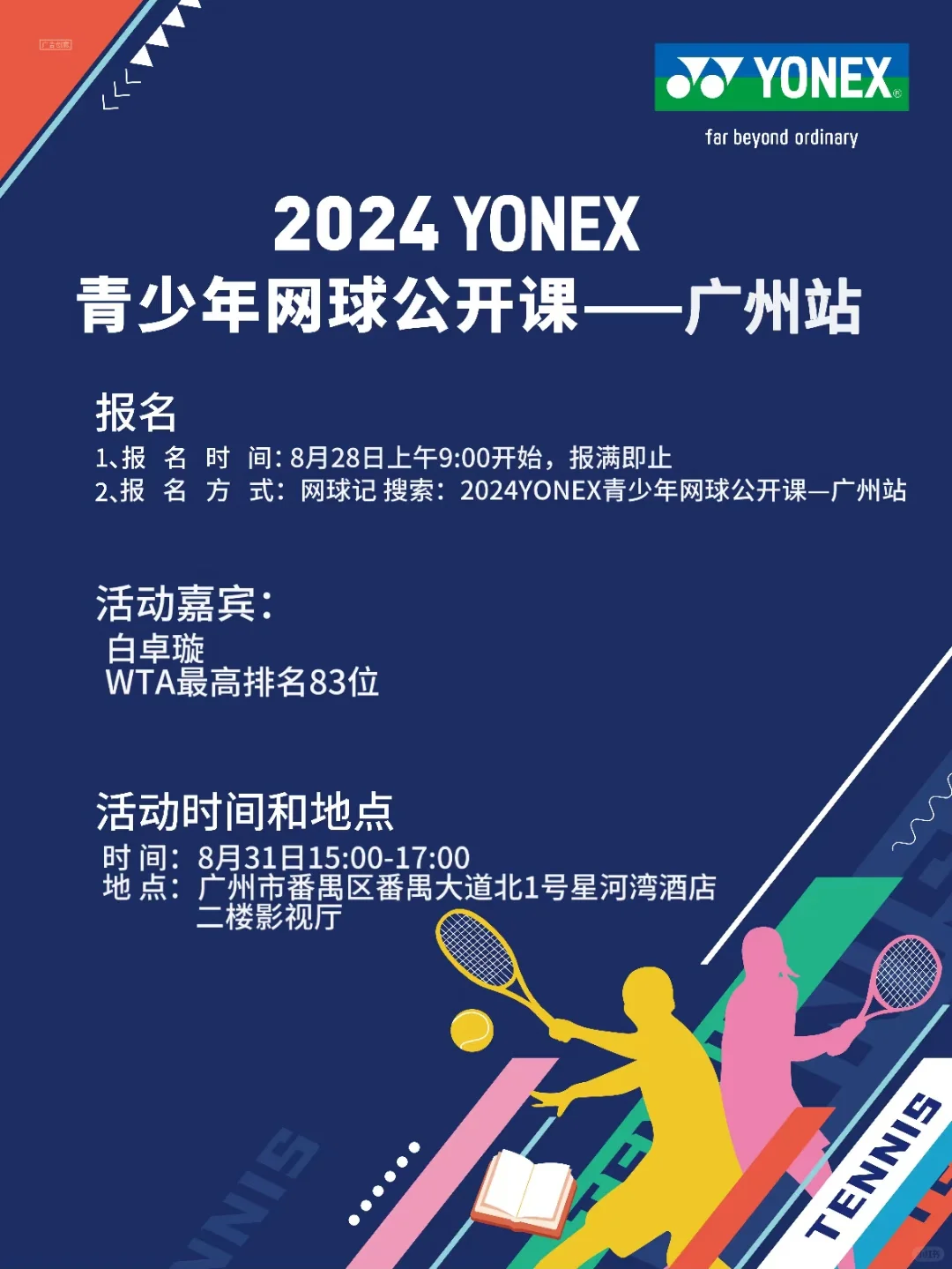 YONEX青少年网球公开课-广州站,8月31日(这周六),特邀嘉宾白卓璇、吴昊[哇] 针对青少年网球小选手们,年龄不限,水平不限,名额有限[奸笑]现已开启报名,抓紧冲[加油]