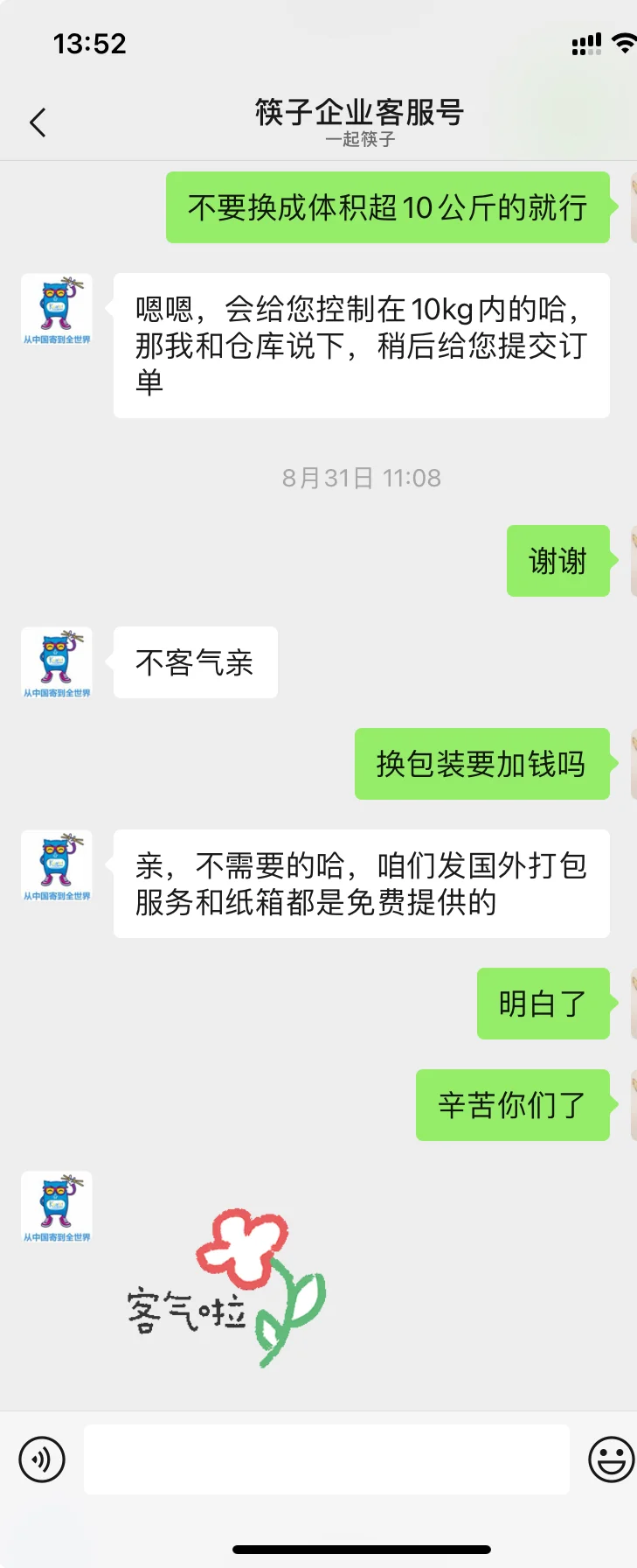 客服的响应速度也让我很满意。几次沟通都是国内晚上的休息时间,但他们依然很及时地回复并解决问题,完全没有拖拉。我平时寄的东西种类多、数量少,他们也能灵活安排,打包时不会浪费空间,还帮我省了不少运费。