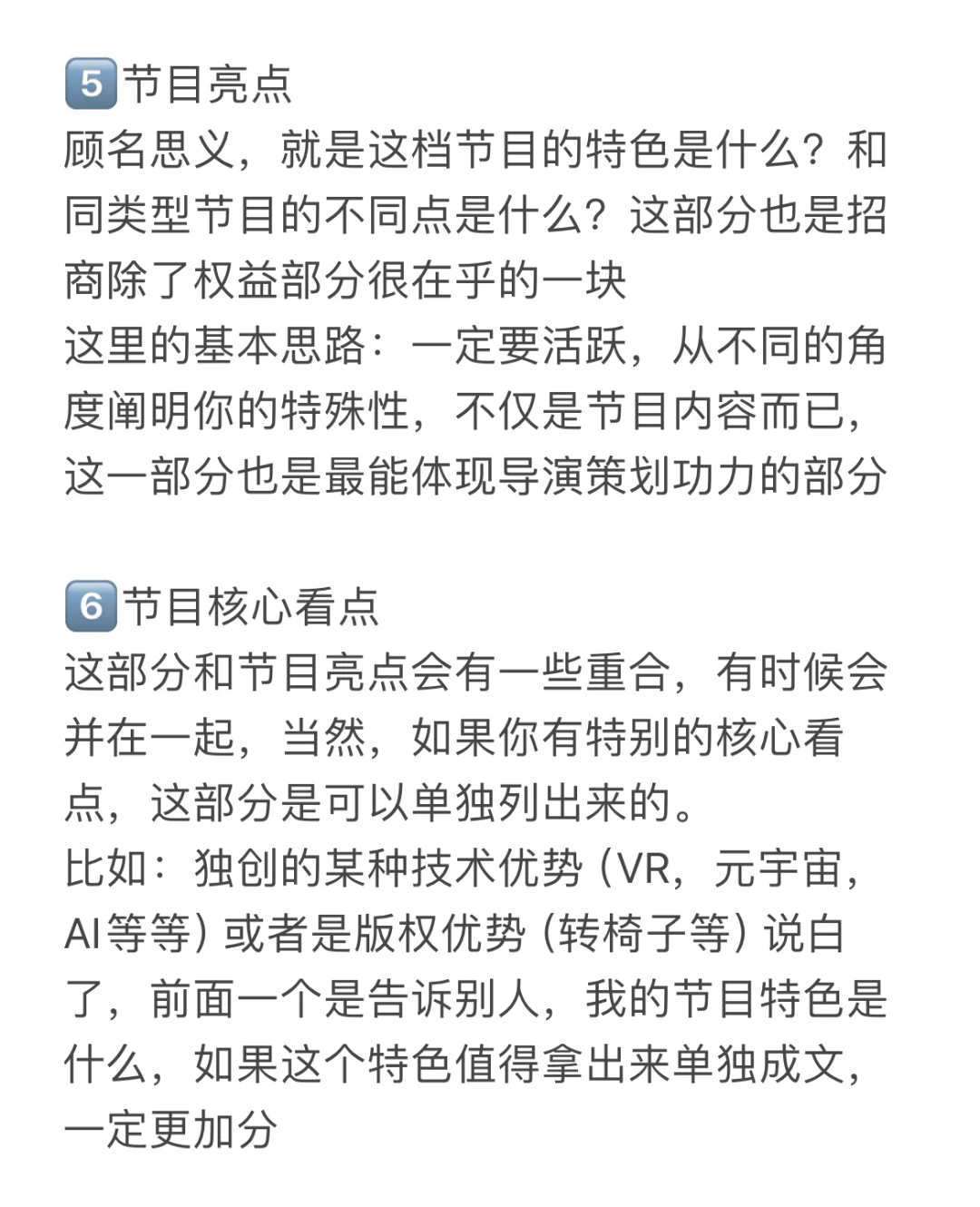 这部分和节目亮点会有一些重合,有时候会并在一起,当然,如果你有特别的核心看点,这部分是可以单独列出来的。